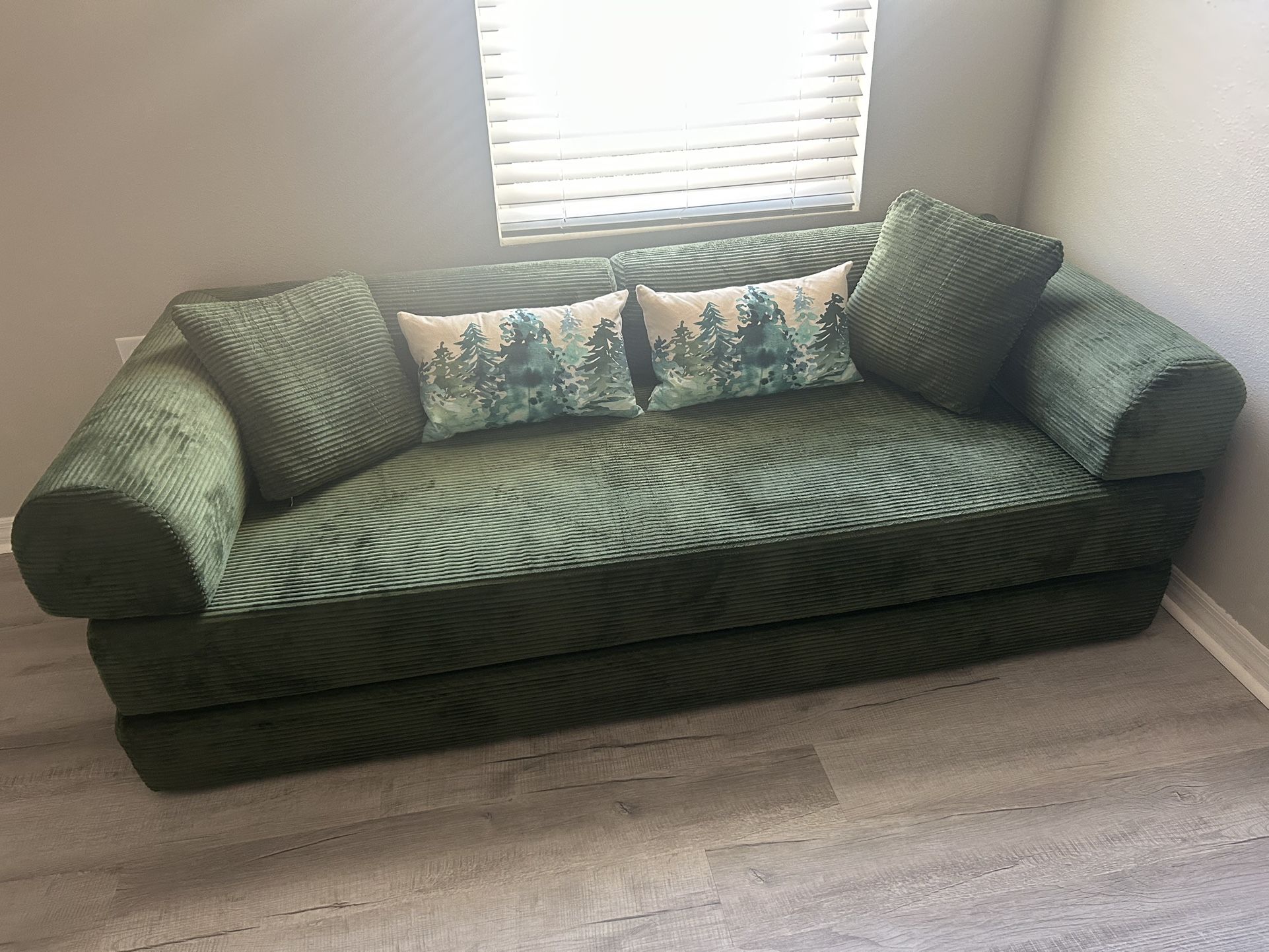 Converts into 2 XL twin beds. Great for an office, guest room, or play room. The couch is brand new out of the box. No rips, stains, or tares. Pretty dark/olive green color. We are expecting a baby and need to now create a nursery in this room and don’t have the space for this anymore. We can negotiate dropping it off for you if needed.