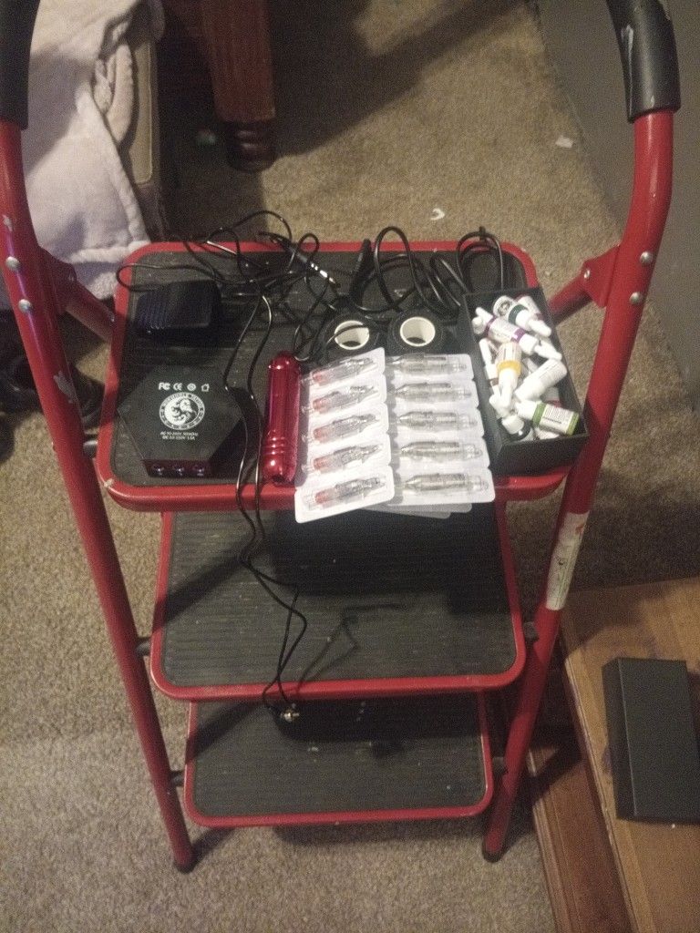 Brand new never been used comes with all cords tattoo pen needles inks gloves fake skin and transfer paper and 2 black tattoo tapes