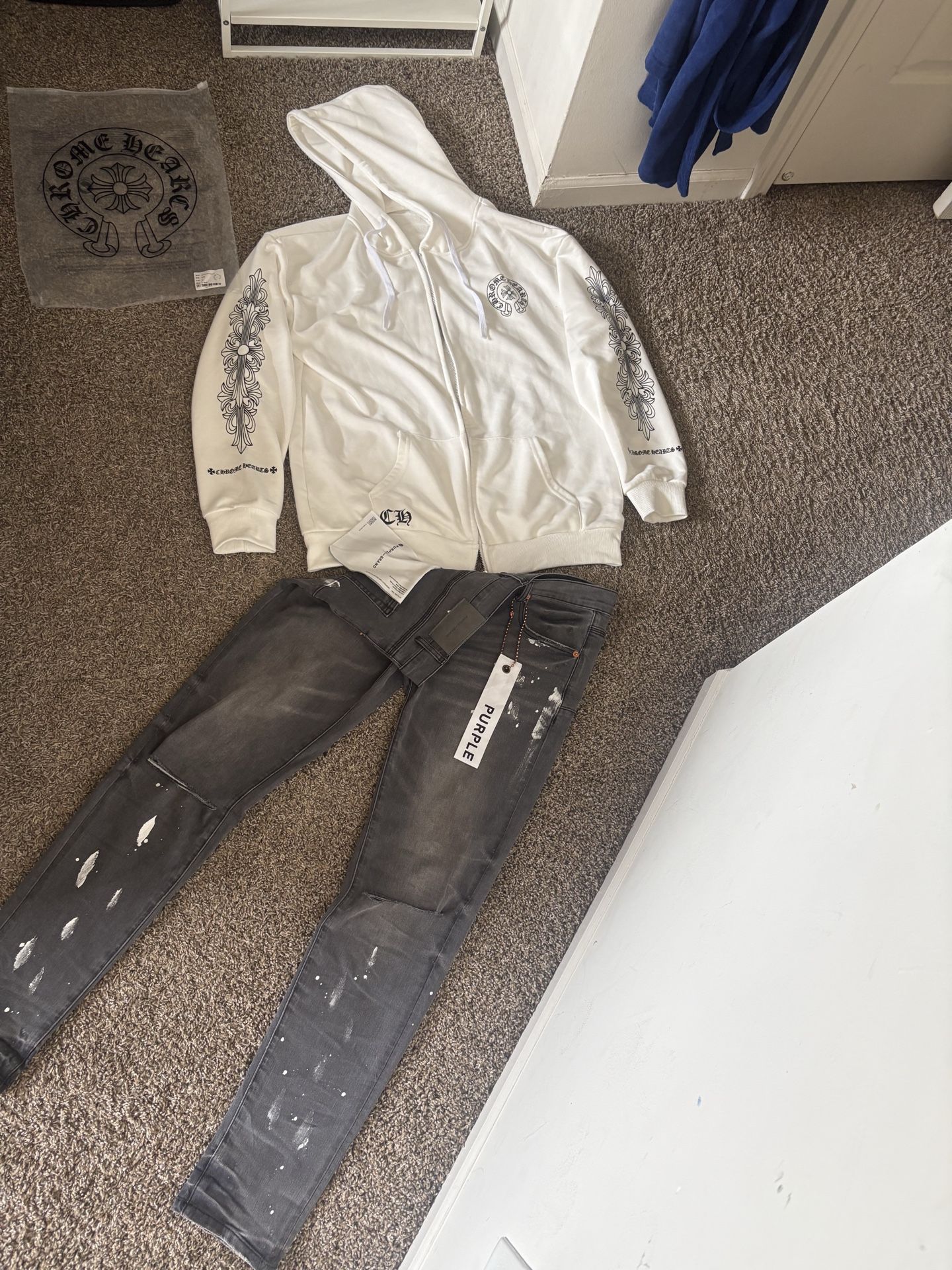 chrome hearts hoodie & purple jeans