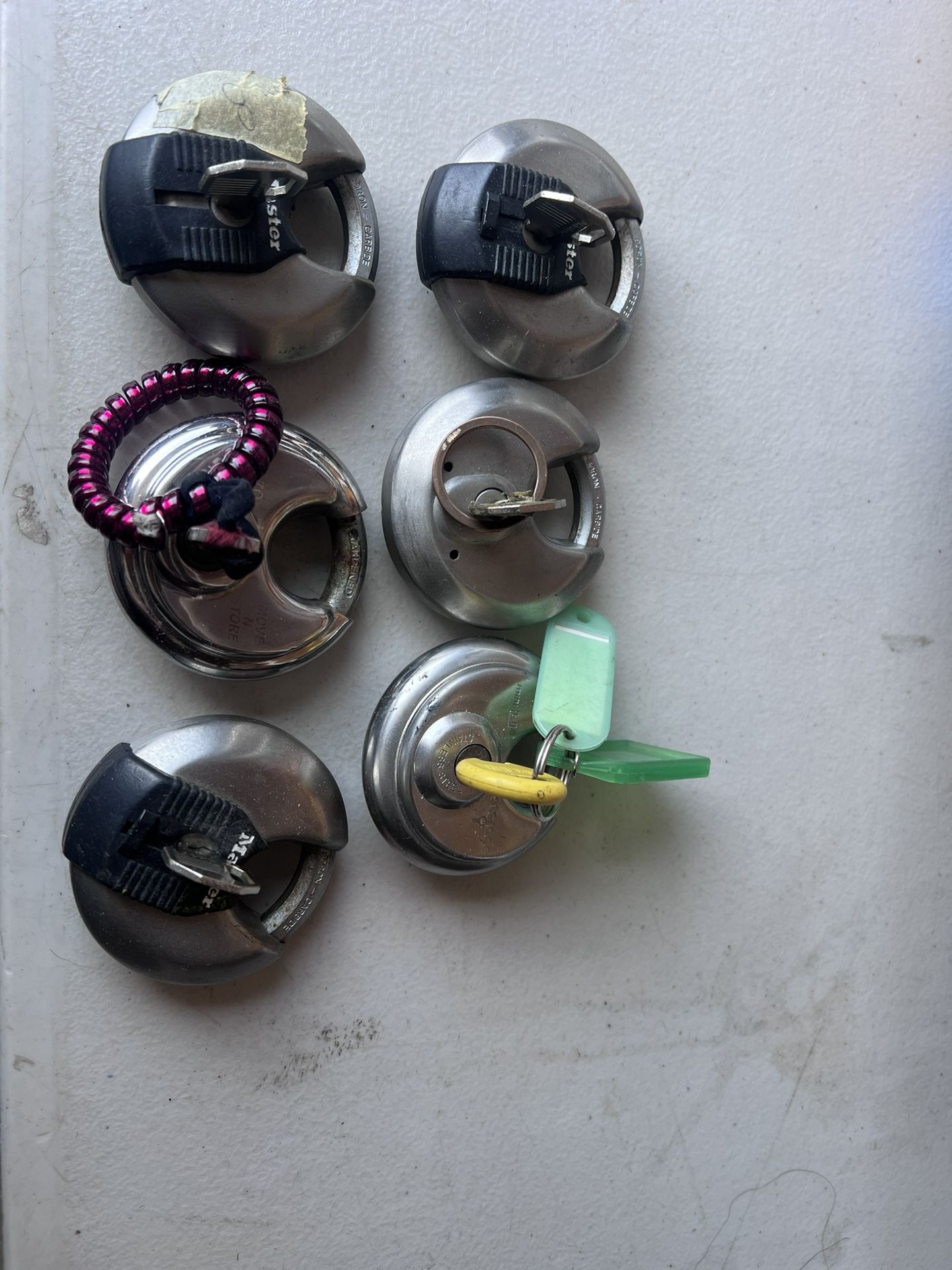 💪 Lot of Heavy Duty Disc Locks – Used Set of several round disc locks, great for storage units, gates, trailers, or sheds. Some are Master style security locks. Used but solid metal and heavy duty. Sold as a lot. 💲Price: $30 for all Pickup in Pomona.