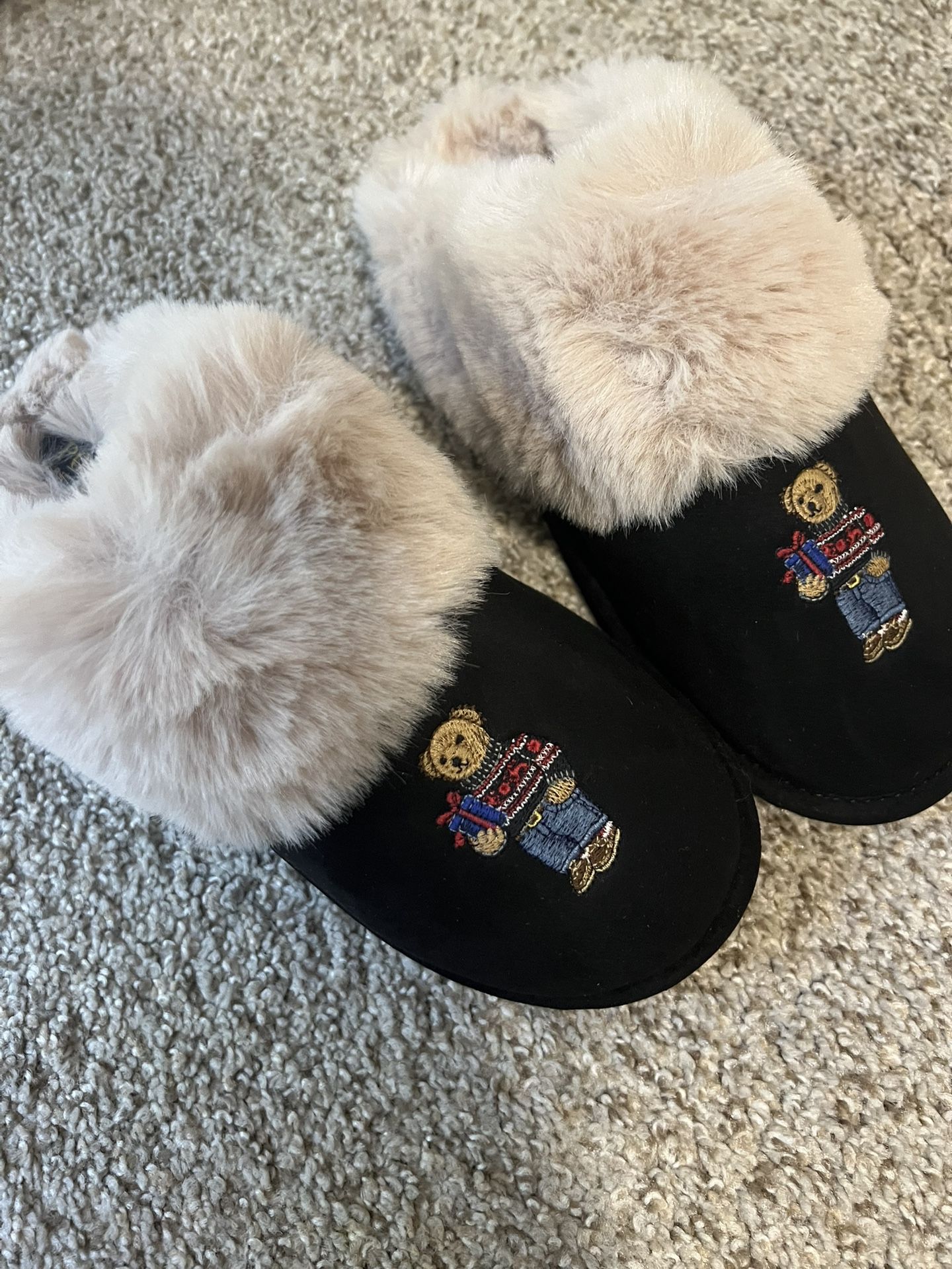 Brand new women's Polo Bear slippers are on sale, color black size 9. The store price is $125