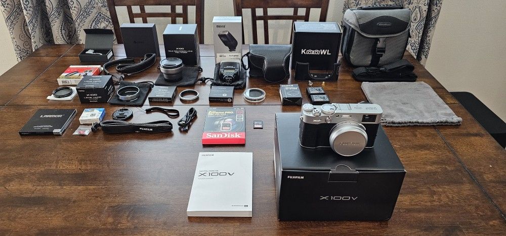 Available here is the biggest and best FUJIFILM X100V ULTIMATE SYSTEM available ANYWHERE! The heart of the System is a VIRTUALLY BRAND-NEW Camera with LESS THAN 700 SHUTTER ACTUATIONS! (It automatically rounds-up to the nearest 100 actuations.) A few details about the Camera itself: The Fujifilm X100V is a premium compact camera featuring a 26.1MP APS-C X-Trans BSI CMOS 4 Sensor, a redesigned 23mm f/2 Lens (35mm equivalent). It also has a 3.0" 1.62m-dot Tilting Touchscreen, 1080/120P & 4K/30p Video, a 0.52x Optical/3.69m-dot OLED Hybrid Viewfinder, Face & Eye Detection, Built-In Battery Charging and Weather Sealing. But that doesn't even scratch the surface of all that this ULTIMATE SYSTEM comes with! Keep in mind that EVERYTHING that it comes with is ALSO VIRTUALLY BRAND NEW! Some items haven't EVER even been used. Are you ready? Here's the exhaustive list: * AS-NEW FUJIFILM X100V Compact Digital Camera with Lens Cap and LESS THAN 700 Shutter Actuations! * FUJIFILM-Branded Neck Strap (Unused) * Original USB-C Cable (Unused) * Original Manual (Unused) plus All Extra Documentation * Original Box * FUJIFILM FUJINON TCL-X100II Tele Conversion (Telephoto) Lens that causes ZERO f-Stop Change! * Both Original Front & Rear Lens Caps * Soft Carry Pouch and Manual * Original Padded Box (Unused) * TWO (2) OEM FUJIFILM NP-W126-S Batteries (One (1) Unused) * SANDISK 512GB Extreme PRO SDXC Memory Card * MEIKE MK320 SPEEDLITE Bounce Flash with Diffuser, Carry Case, USB Cable and Manual in the Original Box. NOTE: This Flash is specifically MADE for FUJIFILM Cameras. It is a Fully-Functional SPEEDLITE, with Master/Slave Capability, IR Focusing-Aid LED, LCD Display and Manual/Automatic Control. It's powered by two AA Batteries (which can be charged via the USB cable if using rechargeable batteries). (Unused) * FUJIFILM LH-X100 Lens Hood and Soft Carry Pouch in Original Box (Unused) * TWO (2) FUJIFILM AR-X100 Adapter Rings (ONE (1) in Original Box and ONE (1) in Lens Hood Box). NOTE: This Ring is Necessary for WEATHER SEALING. (One (1) Unused) * FUJIFILM PRF-49S Protector Filter with Clear Plastic Case and Instructions in Original Box. NOTE: This Filter is also Necessary for WEATHER SEALING. * AGFA PHOTO 49mm Multi-Coated Circular Polarizer (CPL) Filter in Plastic Case and Original Box (Unused). * Aftermarket 49mm Lens Cap with elastic Lens-Attachment Loop. * LARMOR Ultra-Thin Optical Glass LCD Screen Protector sized specifically for the X100V with Installation Kit and Instructions, in Original Plastic Case and Box (Unused). * LENSMATE LM X100V Silver 3-Position Adjustable Thumb Grip that attaches to the Flash Hotshoe in Original Box. This greatly increases Camera Grip while not blocking quick access to the Thumbwheel/Button located underneath. * JJC Red Soft-Release Buttons that attach to the Shutter Button to both ease half-pressing and add some Extra Style to your Awesome New Camera. There are both Concave and Convex versions as well as Two (2) Rubber O-Rings to maintain WEATHER SEALING in the Original Box. * KOOWL X100V Custom-Fitted Leather Case in Original Box. This is a Gorgeous, Pebbled Leather Case! It's made from Thick, High-Quality Black Leather with contrasting White Stitching. It covers the Bottom, Back (Extra Padded), Top & Front Lens areas, has an attached Black Carabiner and attaches via the tripod mount). * TP ORIG X100V Custom-Fitted Leather Bottom Half-Case in matching Pebbled, Thick, Black Leather with White Stitching. It opens on the bottom for easy access to the camera's Battery/Memory Card Door. It can be used by itself (also attaching via the tripod mount), or when combined with the Larger Case, they become a Full-Protection Carry Case that covers VIRTUALLY ALL OF THE CAMERA. It comes with a Logo Soft Carry Pouch big enough to hold the Camera with BOTH Cases and the Matching Leather Shoulder Strap (below). * CANPIS Matching Black Leather with White Stitching Shoulder AND Hand Straps. Again, made from Thick, High-Quality Pebbled Leather with White Stitching. * EDDIE BAUER Padded Camera Case with Shoulder Strap (Unused). This ABSOLUTELY GORGEOUS Pro Compact Camera ULTIMATE SYSTEM has EVERYTHING! All with Amazing Picture Quality! You can trust my 100% accurate Pics and Condition Descriptions. Any questions? More pix? Just ask! In-person Cash or Zelle Transfer upon inspection please. SHIPPING OPTION!!! I am willing to ship this incredible System, FULLY INSURED, upon a successful Zelle Transfer. To assure you of my integrity, you can see this exact System (and more pictures) on eBay for $500 MORE and also see my many Years of 100% POSITIVE FEEDBACK. Here's the link: https://offerup.com/redirect/?o=aHR0cHM6Ly93d3cuZWJheS5jb20vaXRtLzE0NzE4NTQ3NDk5MA==