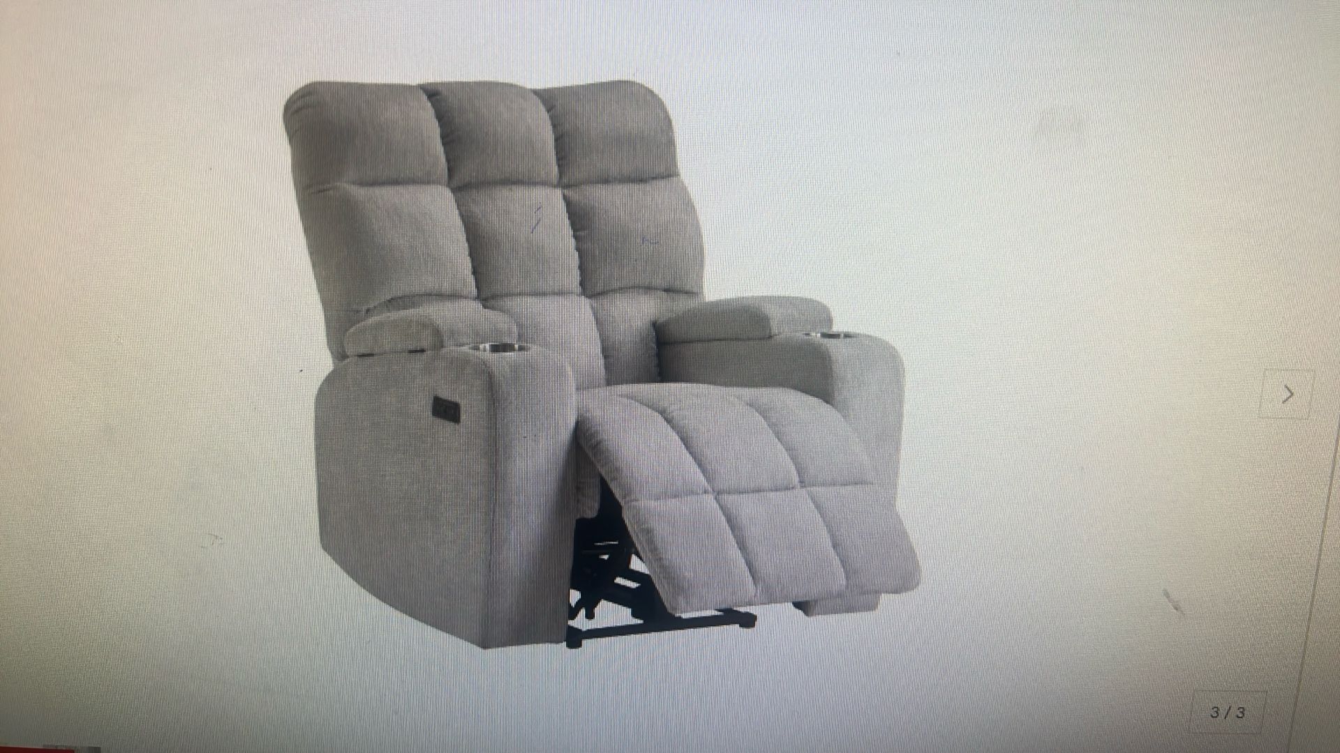 Beige fabric power recliner with cup holders and USB charging. Come in and try this comfy recliner out at 9602 UP River rd