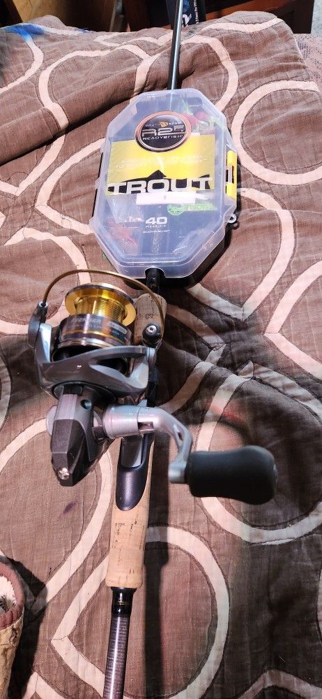 Avenger pole and real. Brand new never used. 7ft. One piece 8 eyes. Action MF/F 8-17lbs 1/8-3/4OZ Comes with a small trout fishing box to get you started. So you need is some fishing line. The reel a okuma avenger AV-300