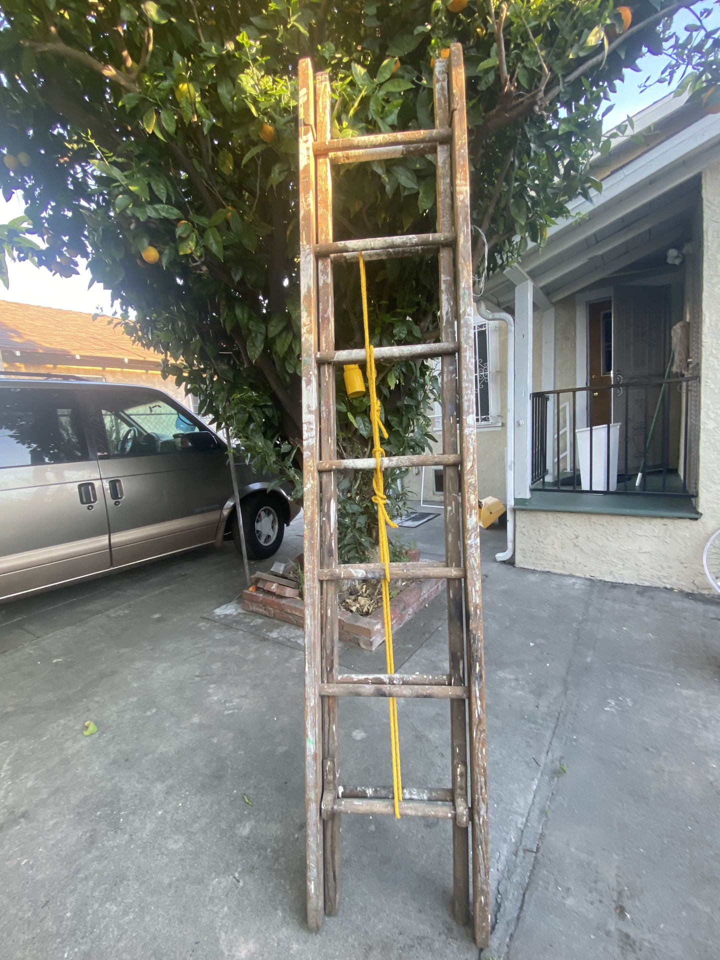 Vintage Wooden Ladder. Constructed with round Rungs. 93 inches tall. Will extend higher