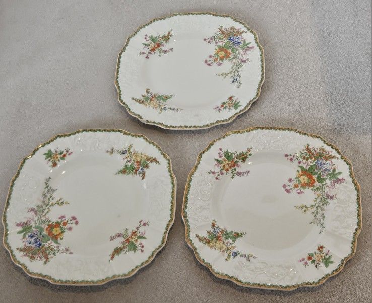 Title: Devon Myott Staffordshire England 7.75" Square Salad Plate Brand: Myott Circa: 1920's Manufactured: England Service: Salad Plate Size: 7.75" Condition Description: Used Condition. One plate has a small chip. Description: From Myott England, vintage dish that is ivory with green and gold trim. It has multicolor flowers and leaves.