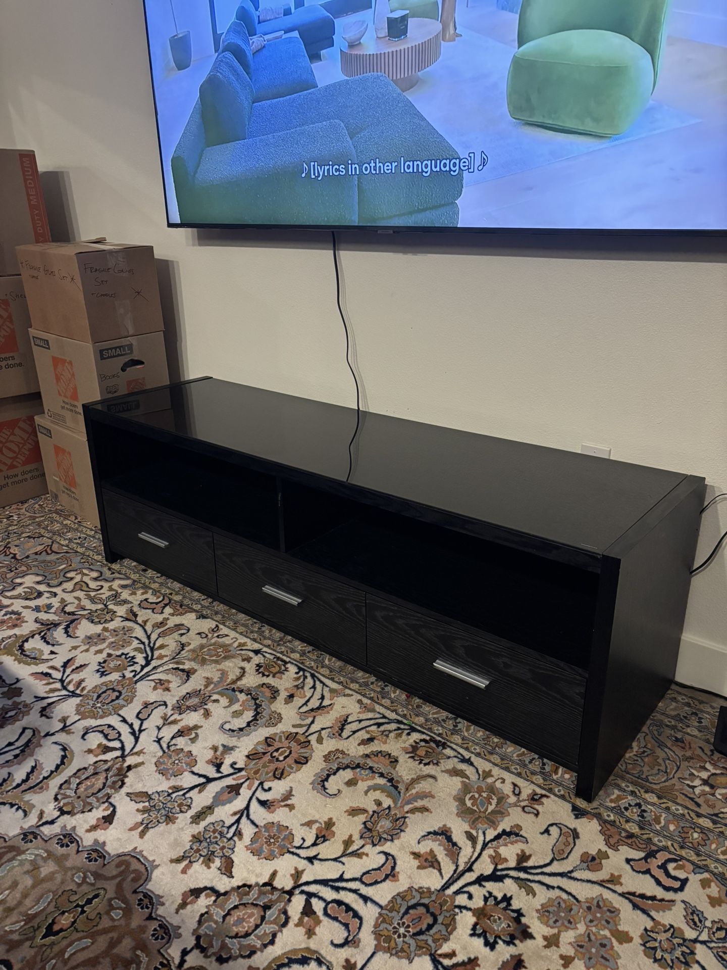 Beautiful 3 storage cabinet, glass-top TV console. 61.5in long 1ft 8in height 18in depth