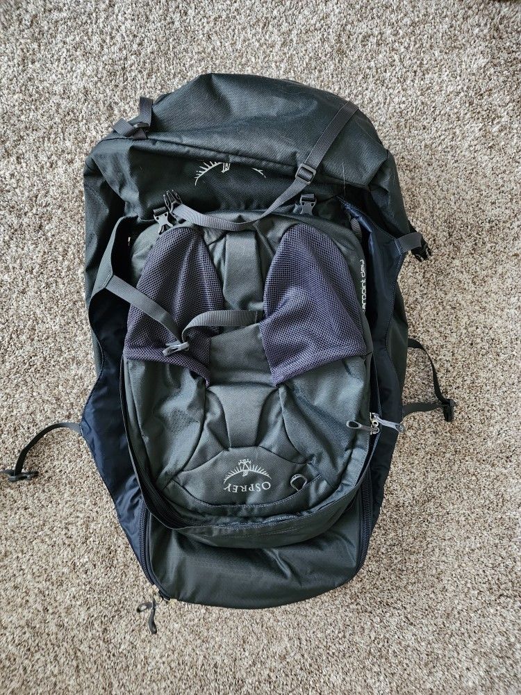Osprey Farpoint 70 travel backpack, which features a removable daypack. Never used. Asking $120.