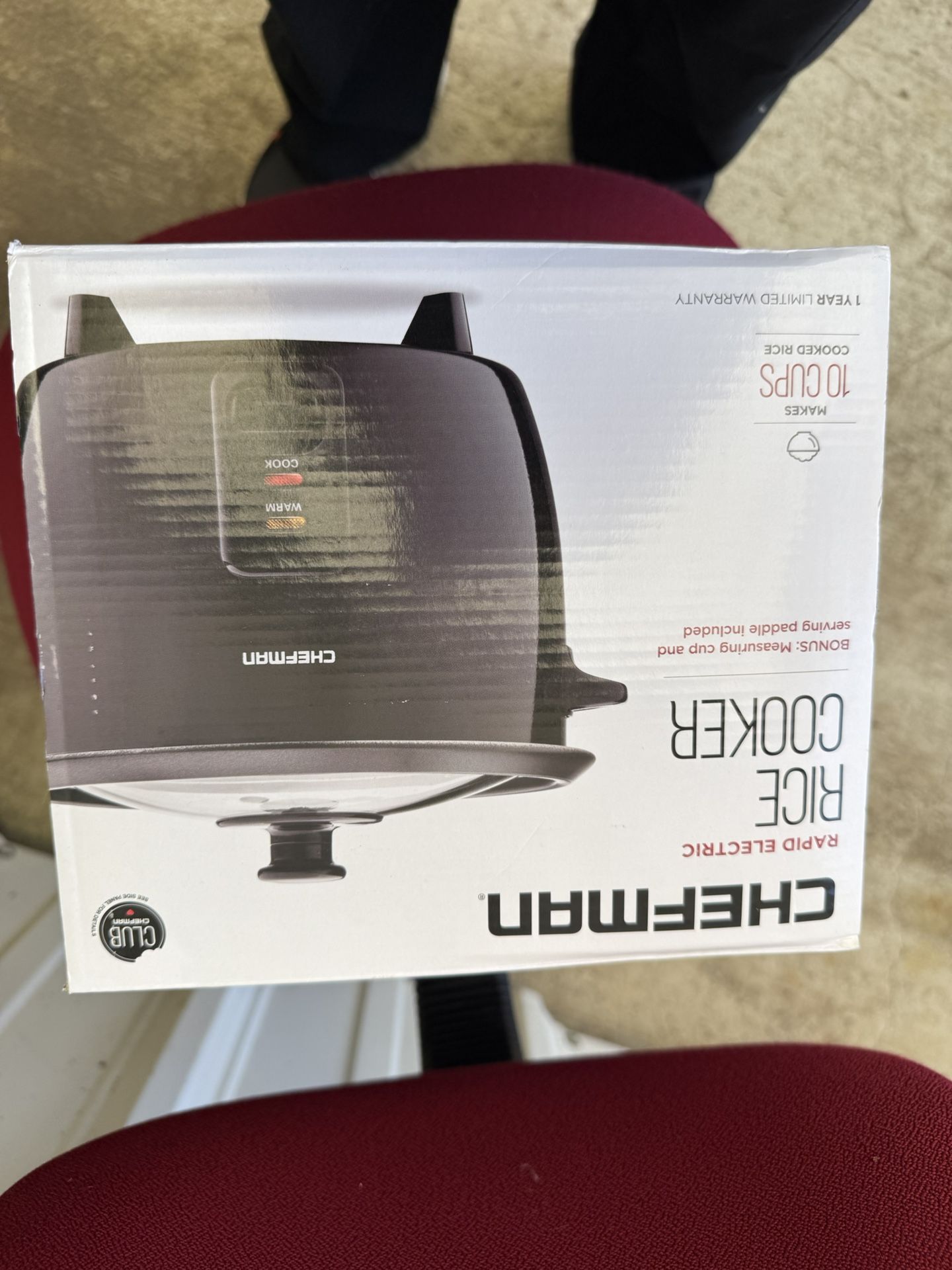 has a 10-cup cooked rice capacity (5 cups uncooked). It features an auto Cook/Keep Warm function, automatically switching to Keep Warm mode once rice is cooked. The rice cooker includes a non-stick removable pot and accessories like a measuring cup and serving paddle, all of which are dishwasher-safe for easy cleaning. It comes with a 1-year limited warranty.