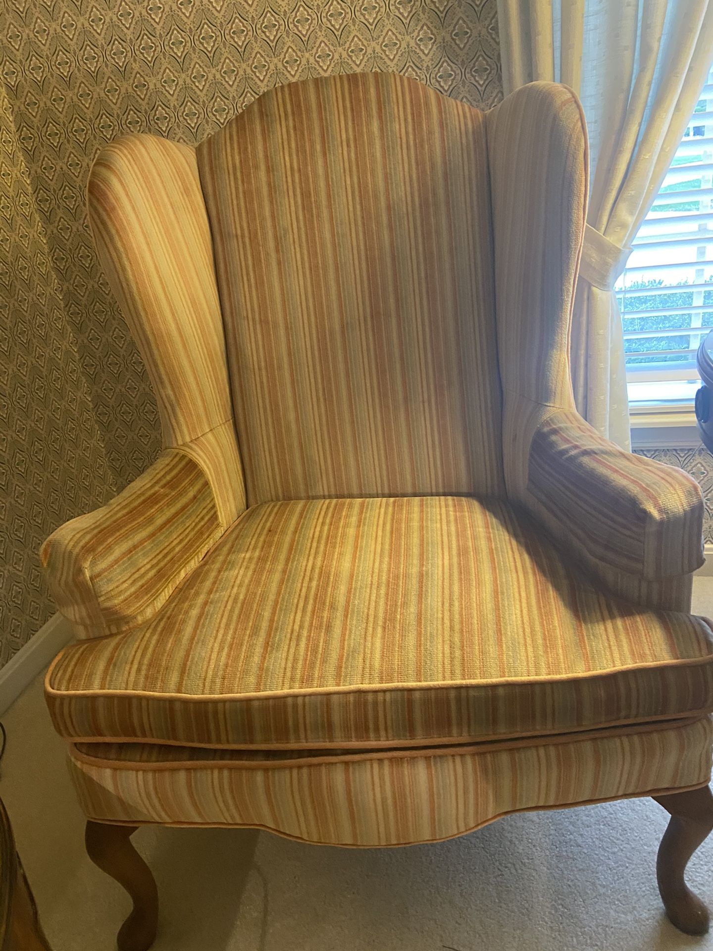 2. Peach /tan stripe velvet Queen Anne matching chairs. Very good condition.