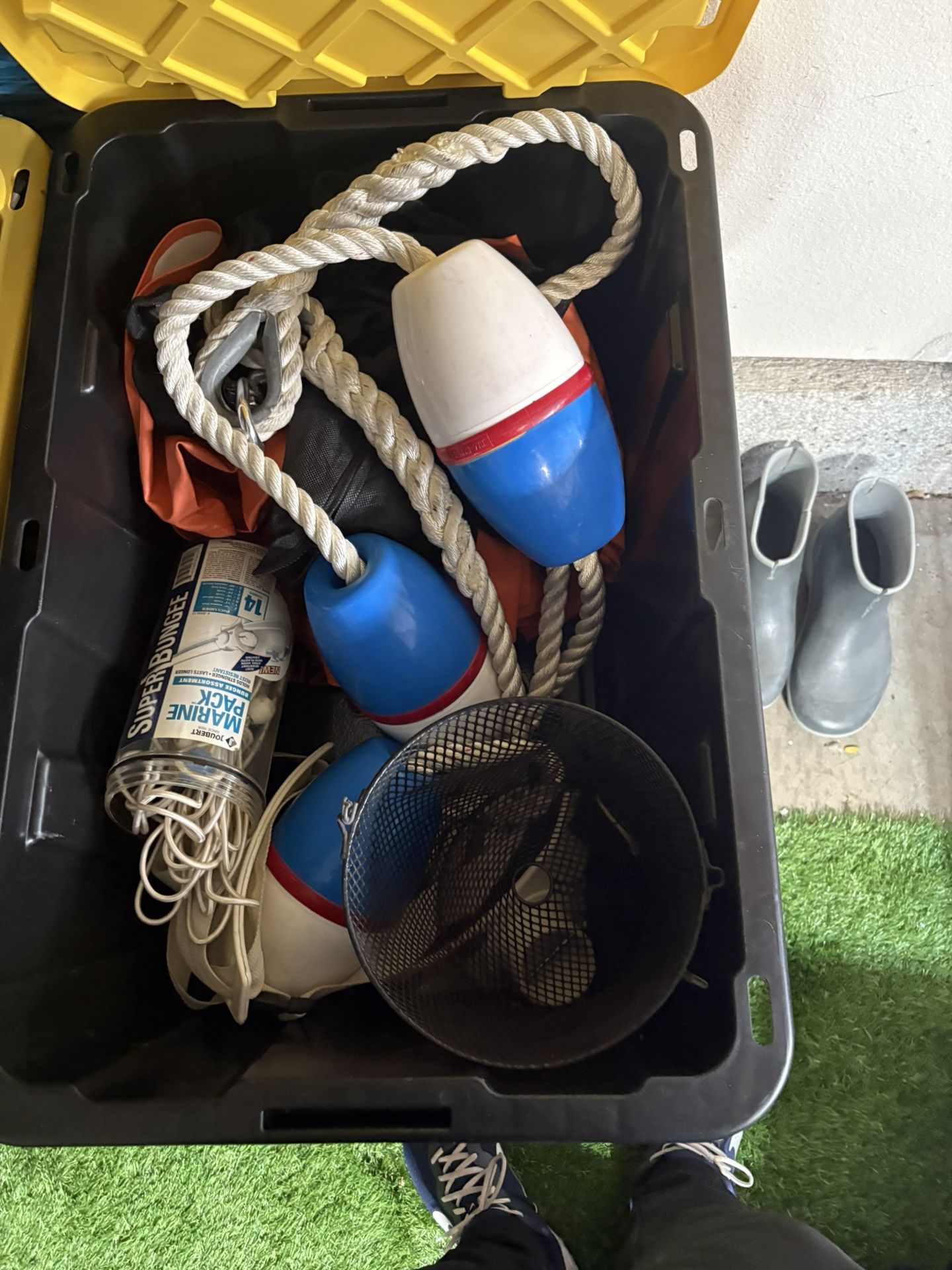 deck boots sz 13 buoy with rope pole harnesses waterproof jacket and pants tie downs