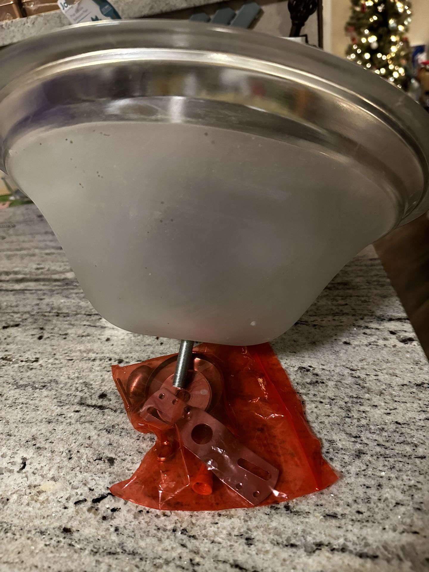 Basic flush mount brushed nickel light fixture with a shade that combines frosted glass and clear glass. Almost 13 inches in diameter and uses two light sockets. All hardware included.