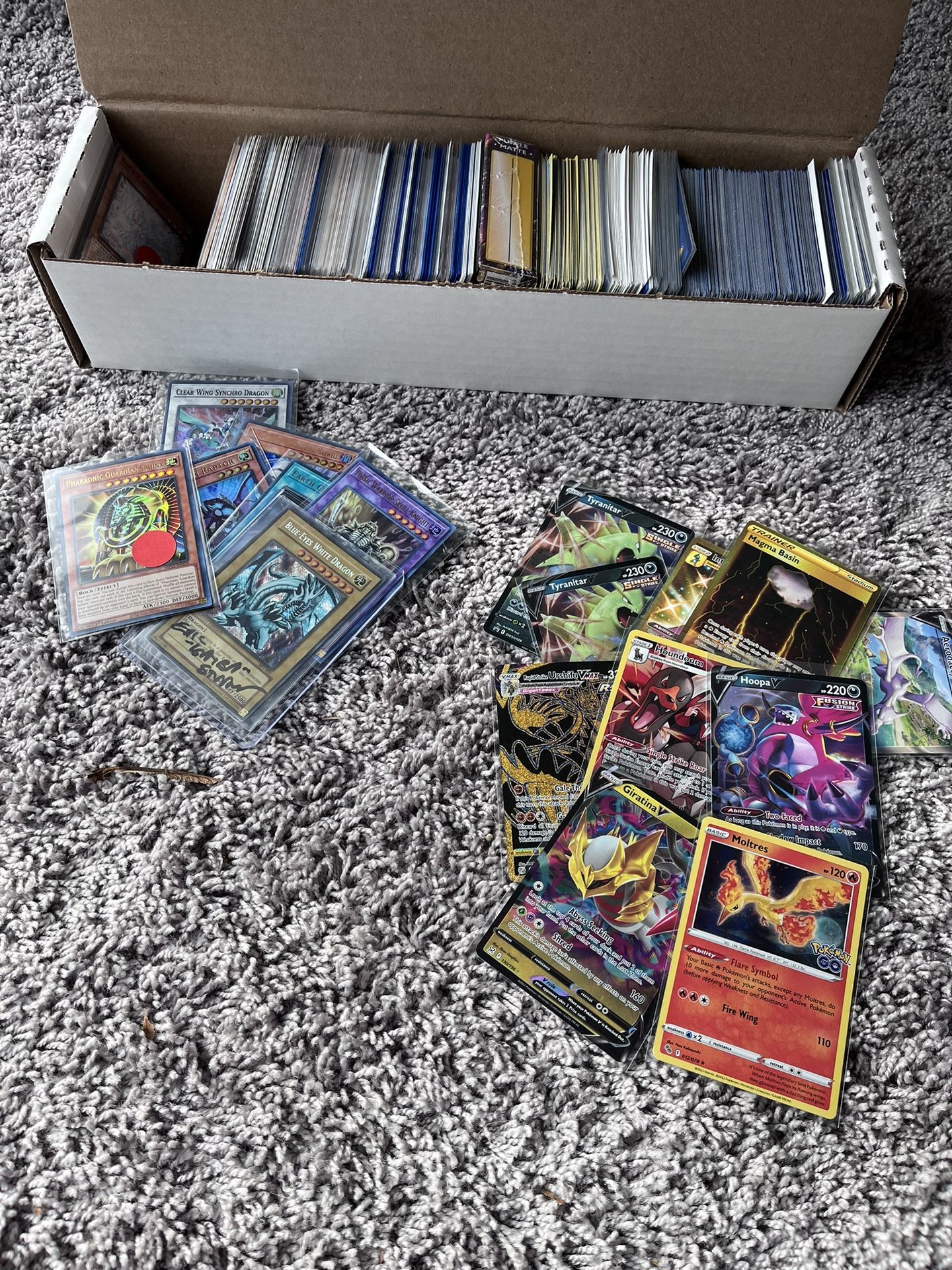 Some great ones and some not. All are in good condition. Random lot of mixed yugioh and Pokémon. One signed by the voice actor of kaiba blue eyes white dragon reverse holo BPT-001($125) the aerodactyl V is 135$ so take it off for 100 All serious offers considered.