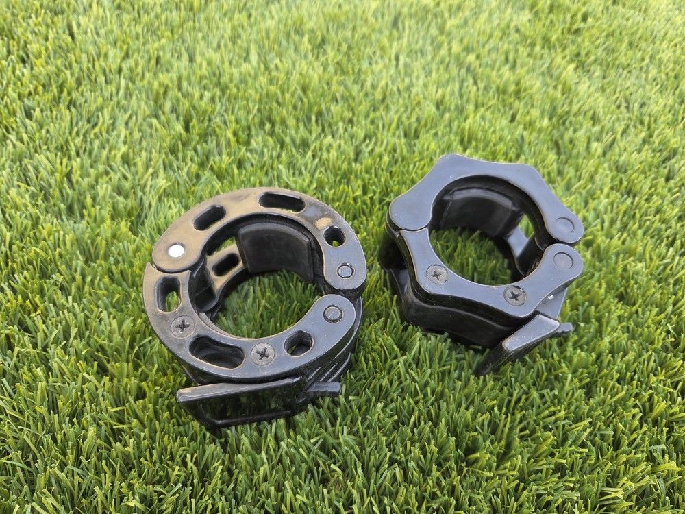 Black plastic barbell clamps. A pair of clamps, great for securing weights on a barbell. Notice they are the same size, slightly different look.