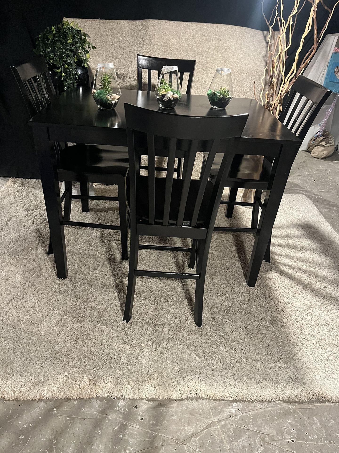 High table and 4 chairs dimensions 40 inch long 40 wide and 40 tall chairs 45 x 26 no holds bring help and a big car cash only have a little damage on the side table