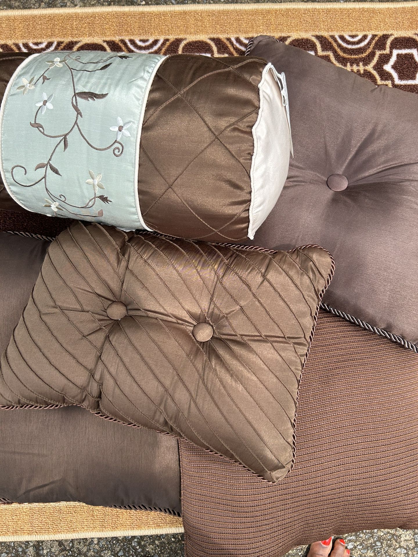 5-6 decorative pillows, 2 long size pillow shams, curtains with valance for 3 windows