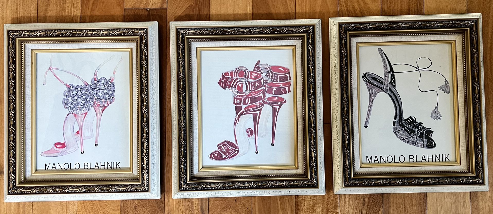 Set of 3 Manolo Blahnik framed artwork - All the same size. Pick-up: Pinole Zelle or Cash Cross Posted