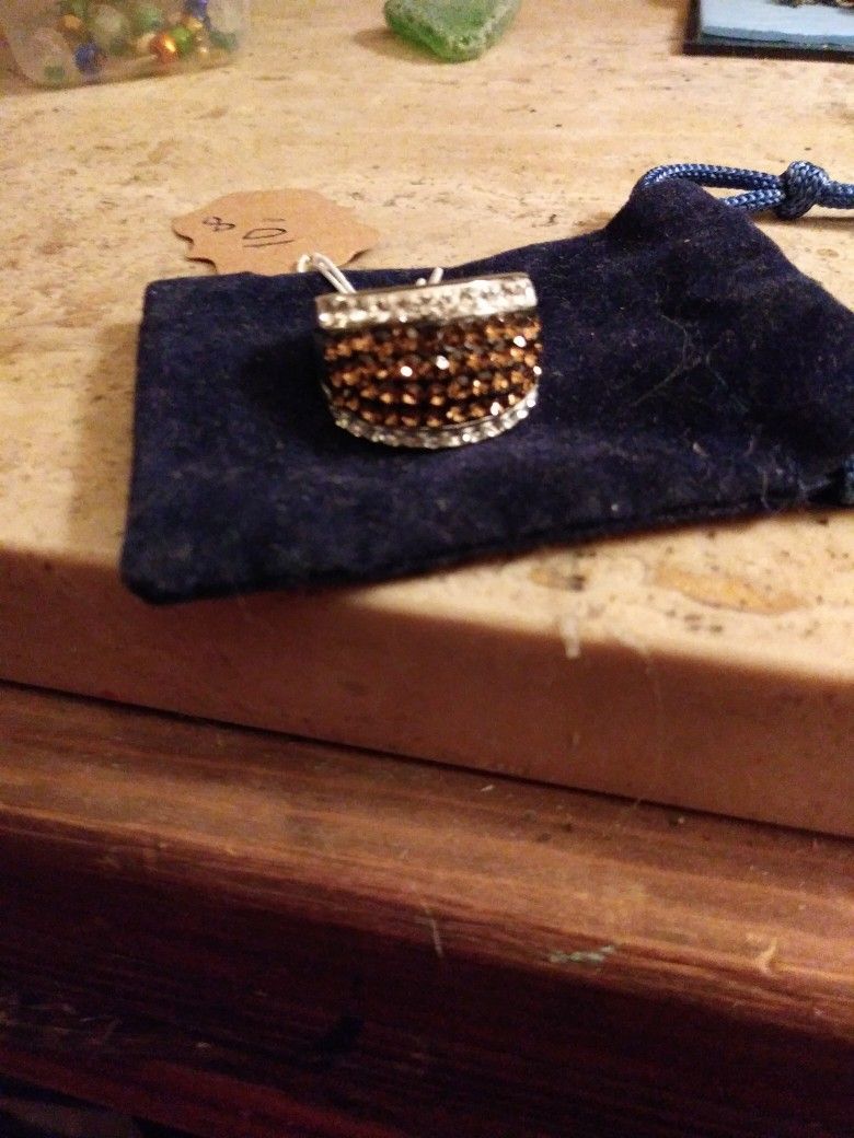 Brown and white Rhinestones on a silver band. Size 5 or 6