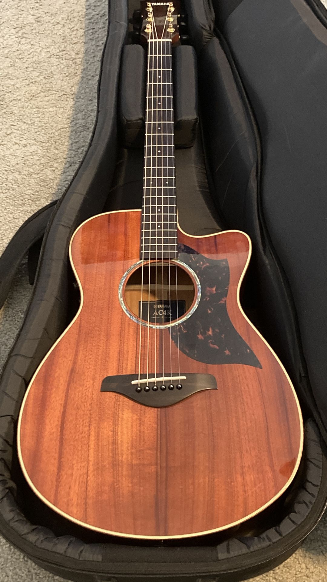 I have for sale my limited edition Yamaha AC4K Acoustic-Electric in excellent condition. All solid Hawaiian koa top, back and sides, 1 11/16 nut width, & 25.5” scale length. Koa is an incredibly beautiful wood, and this guitar is a prime example of that. It has a nice, sweet midrange with bell-like highs while still sounding balanced, in part due to the concert shape. Koa is a hard wood and it in particular opens up with time, so the more you play this, the better and better it will sound. Compare this to an all koa Taylor and you’re saving quite a bit of money while getting just as good of an instrument, in my opinion. I have many Yamahas and they’re all extremely well built, reliable and great sounding instruments. I just don’t play this one enough and need to thin the herd of my collection. The action is a bit high and could use a set-up for player preference. I haven’t touched the saddle height since I bought it, so there is plenty of room for adjustment. No dings, marks or scratches save for normal pickguard wear. It's in excellent condition, near-mint I would say. Comes with a Yamaha gig bag. ***No trades please, unless you happen to have a low-watt tube amp*** Thanks for looking! ~~~ Crafted from all solid Hawaiian koa, the Limited Edition AC4K features the A-Series cutaway concert body, double-line abalone inlays, and unique black tuning machine keys together with specially recorded mic models on the SRT preamp for plugged-in tone that matches the acoustic sound. The SRT2 Piezo and Preamp lets players choose from two mic settings that can be blended. With an incredible midrange focus and bright tone delivered by koa, the AC4K is a perfect fit for fingerstyle guitarists. The SRT system lets players choose from two different mic settings (large diaphragm and active ribbon microphones) that can be blended with the piezo pickup. In addition, the SRT system's auto feedback detector cancels feedback frequencies in live situations.