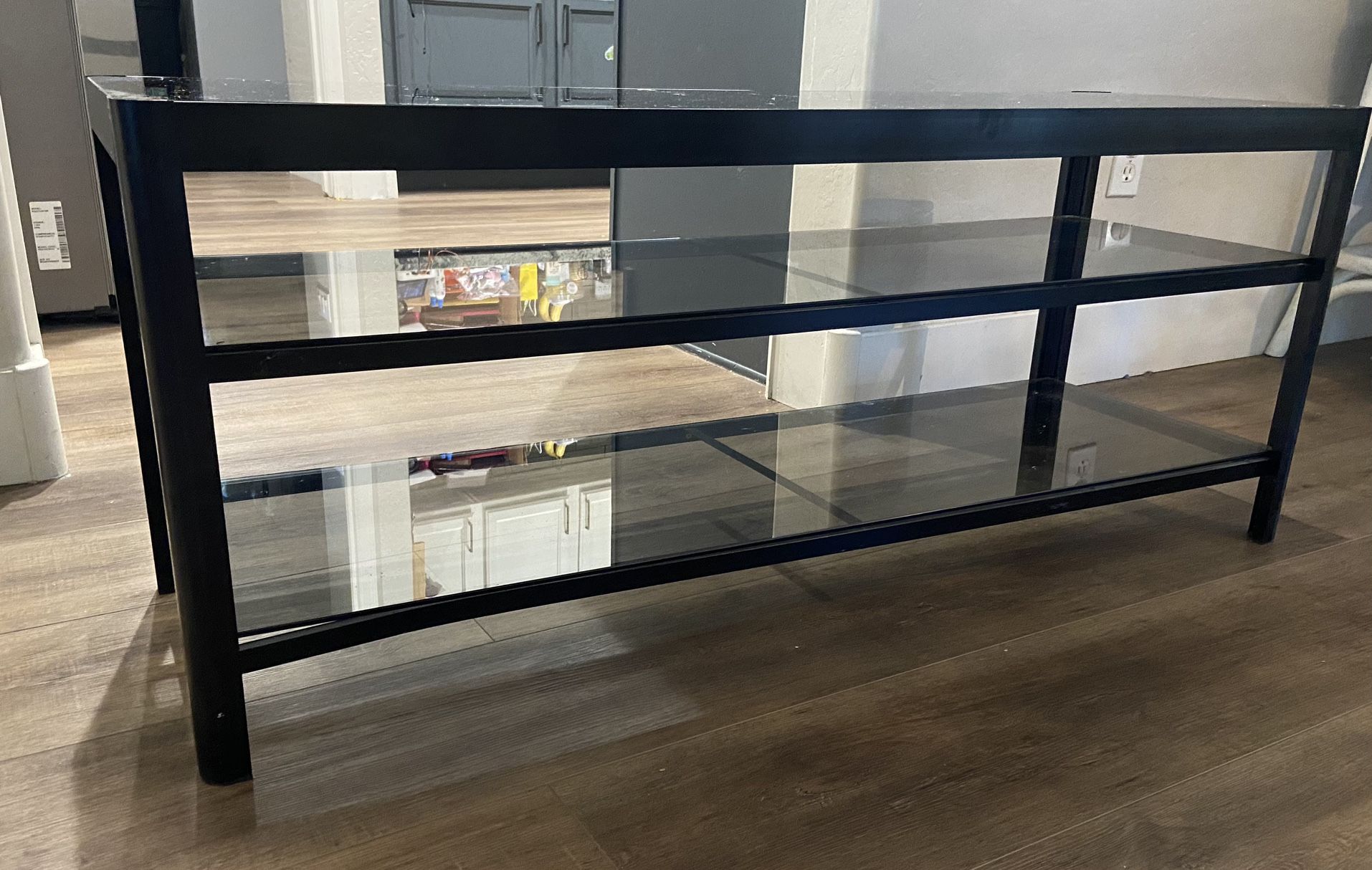 Glass and black metal 3 tier entertainment center from IKEA. Dimensions- Width: 47 inches, Height: ~19 inches, Depth: ~16 inches. Bottom shelf is slightly warped (see last photo), but functions perfectly.
