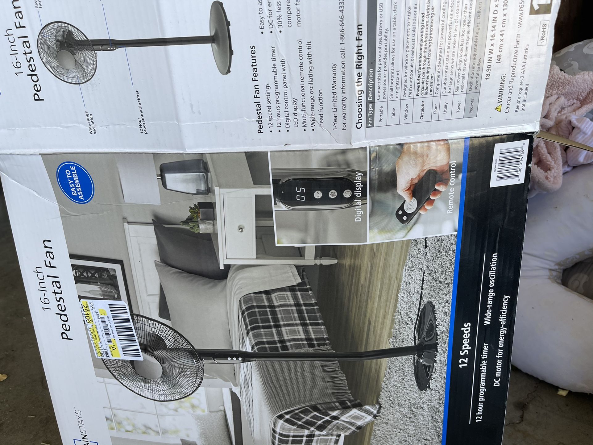 I have a 16” pedestal fan, never used still in box and original packaging. It has a digital display, 12 speeds, and remote control. Asking $40