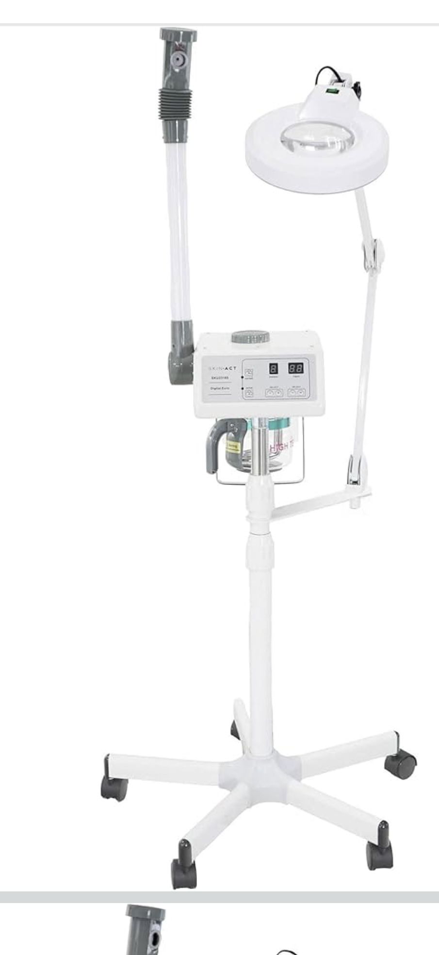 Brand new SKINACT Digital Euro Facial Steamer with Aroma Therapy + LED Magnifying Lamp. Mechanical timer Aroma therapy basket Moveable arm Moveable steamer arm with rotation capability Aroma therapy basket LED magnifying light with 50,000hrs lifespan (15yrs of usage) Ultra-high-quality and durable material