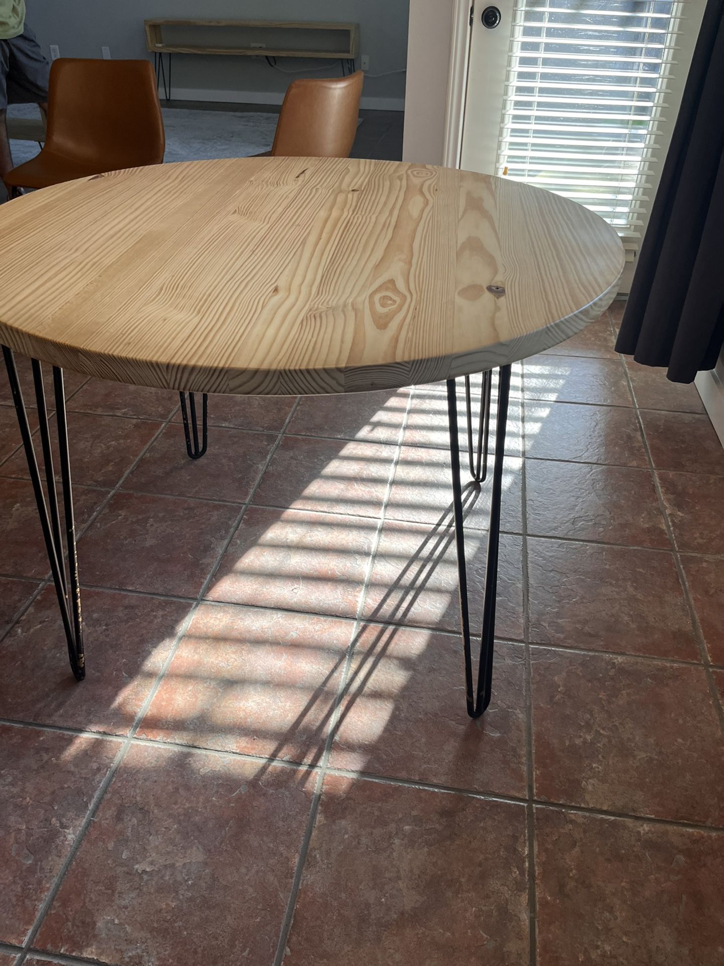 Solid wood dining table 41” diameter. Good condition. Metal table legs have some paint chipping that could be repainted. See photos.