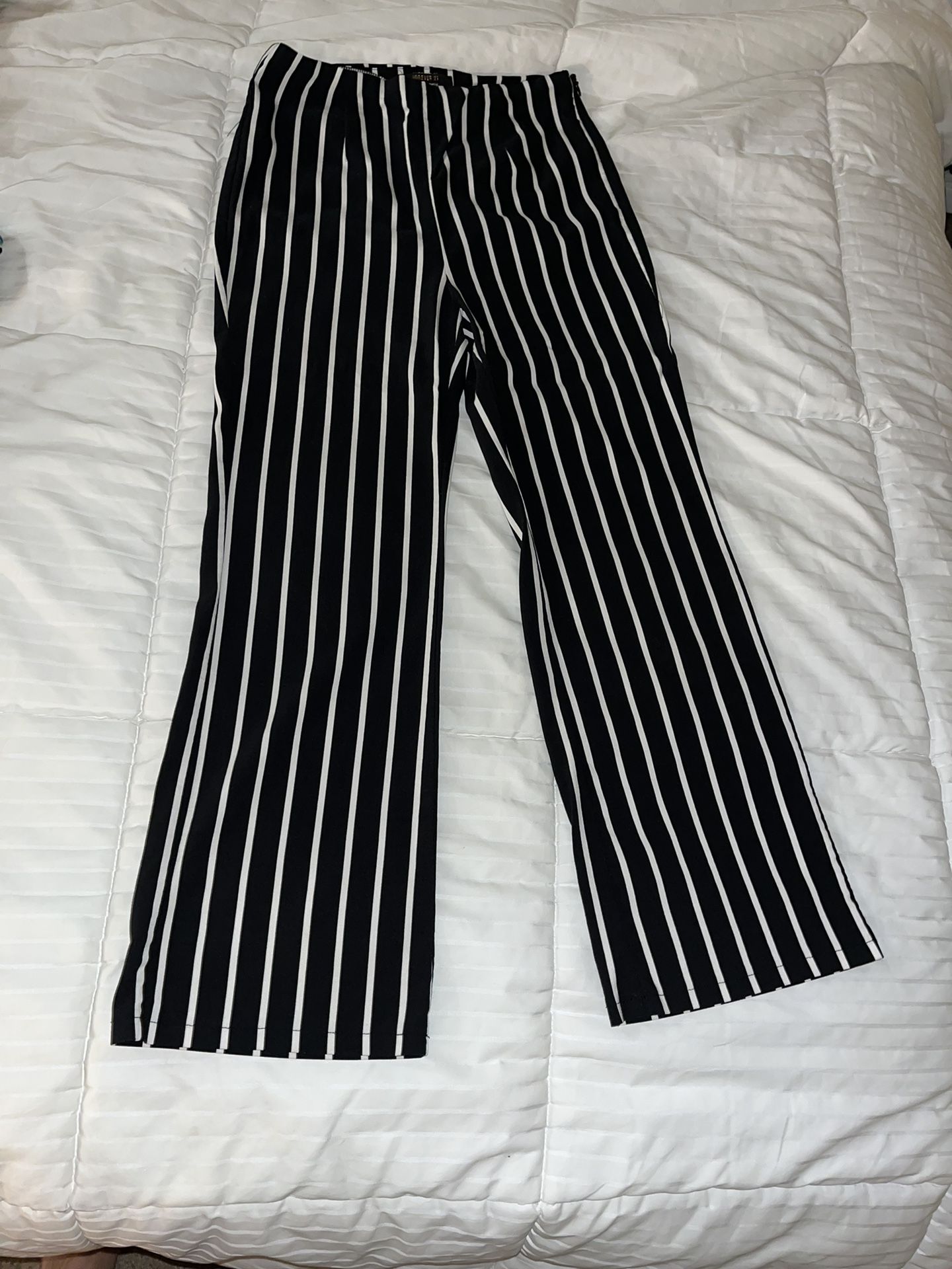Forever 21 striped black and white pants/slacks. Zipper on the side but does have some stretch. Slightly bell bottomed. Size Large but fits in between medium and large.