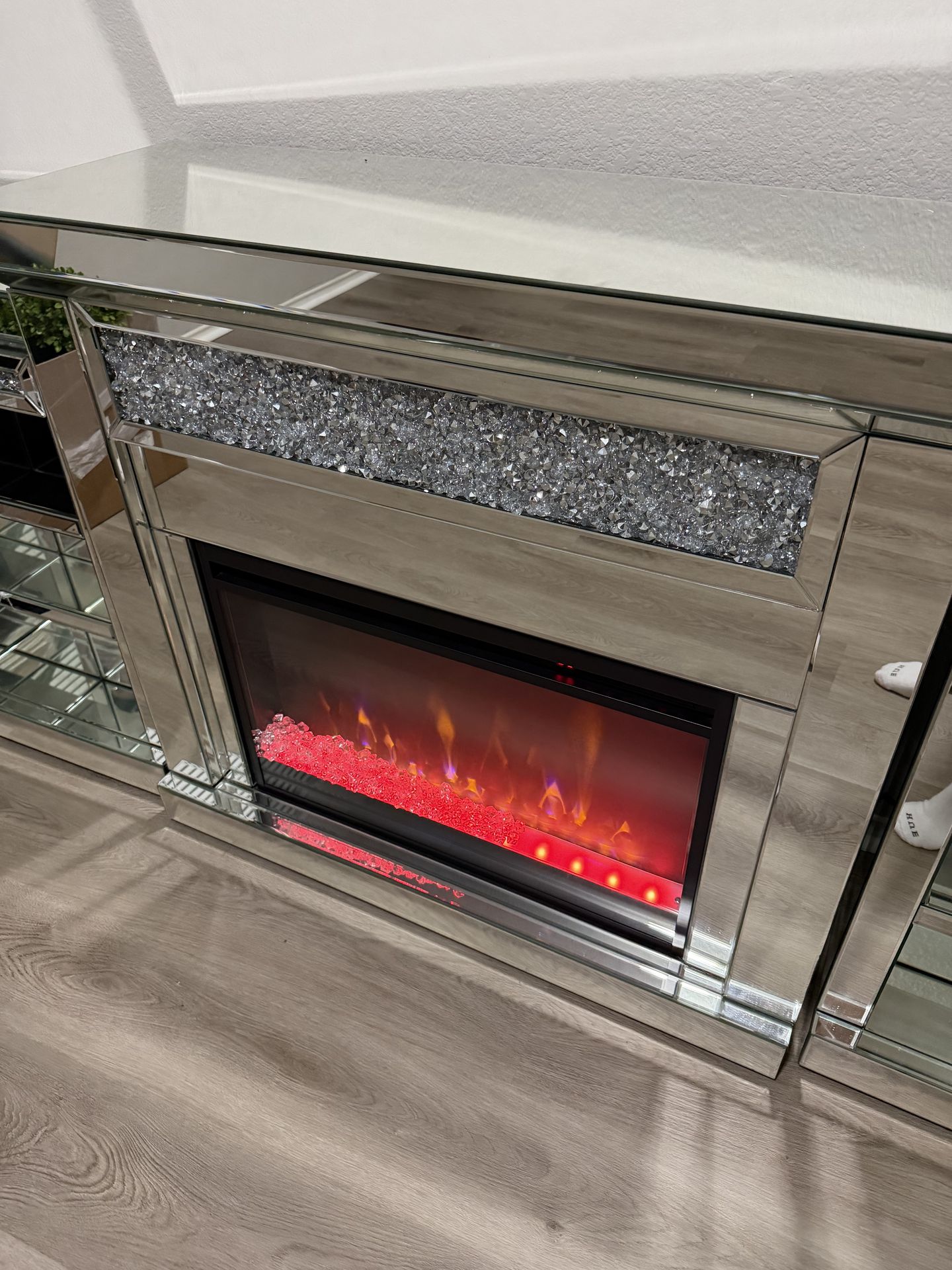 This mirrored fireplace was initially $1,500 I am now open to letting it go for 300$ pick up only , it has 2 small cracks on the far left side but it’s barely noticeable due to it being mirrored you can hardly see it. It is still very functional I used it during the winter storm for extra heat. Can definitely heat up a place if needed has various light settings & heat settings.