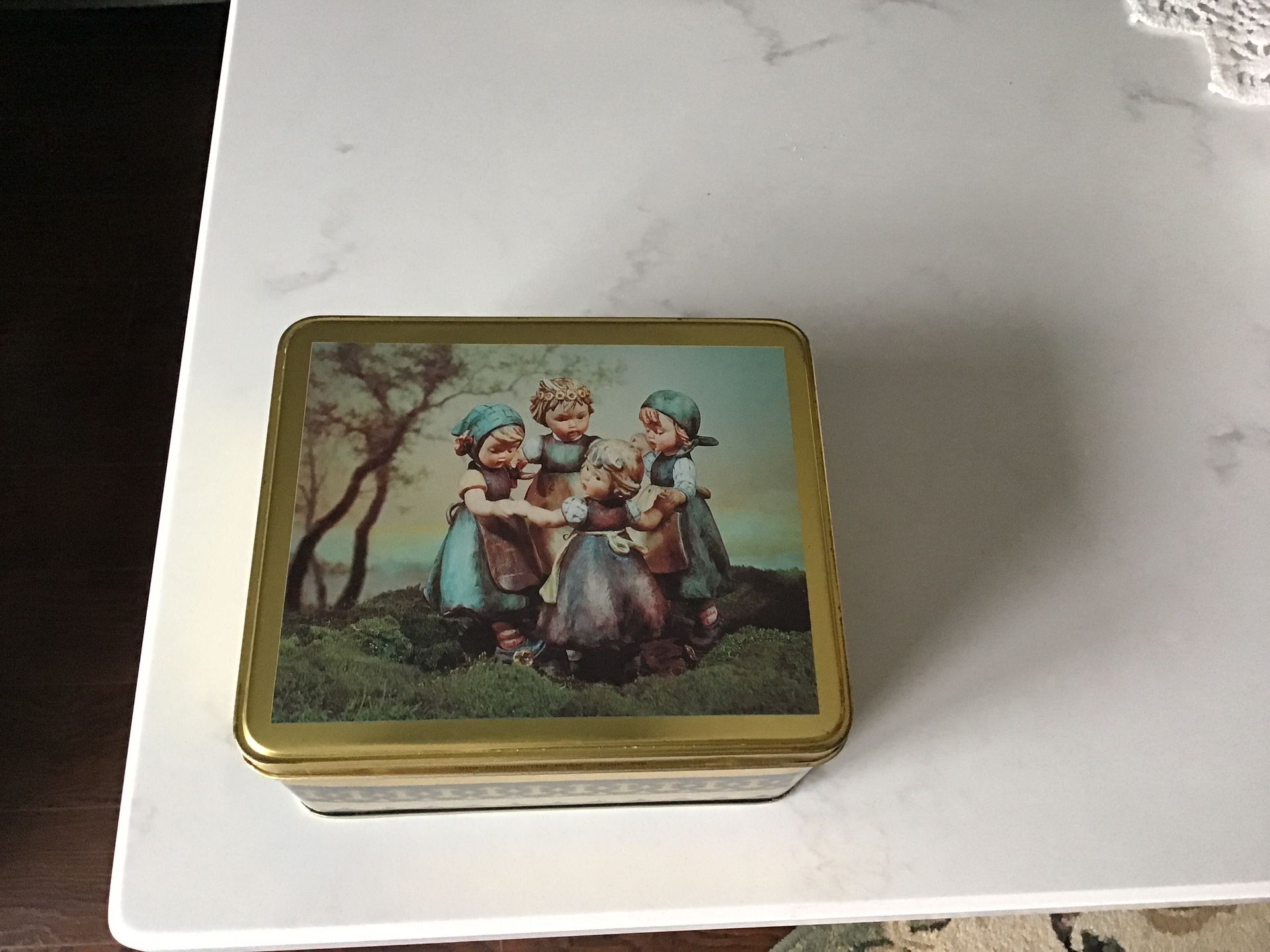Approximately 6 1/2 by 5 1/2”. Images on tin are based on original artworks by Sister M. I. Hummel. Excellent condition.