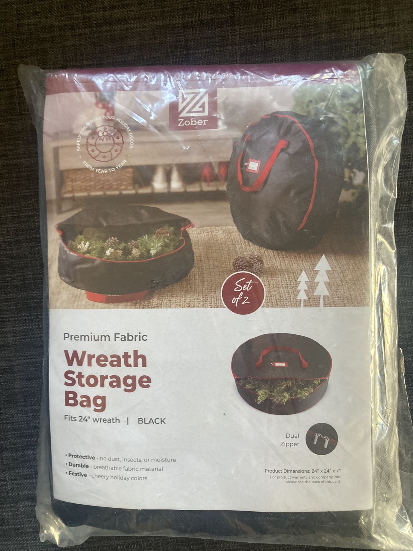 wreath storage bag. set of 2. bkack , new. fits 24 inches . double zipper. dimensions 24x24x7 set de 3?bolsas de almacensje. nuevos, negras, caben articulaciones de 62 centimetros de diametro d, doble cierre. medidas 24x24x7 pulgadas.