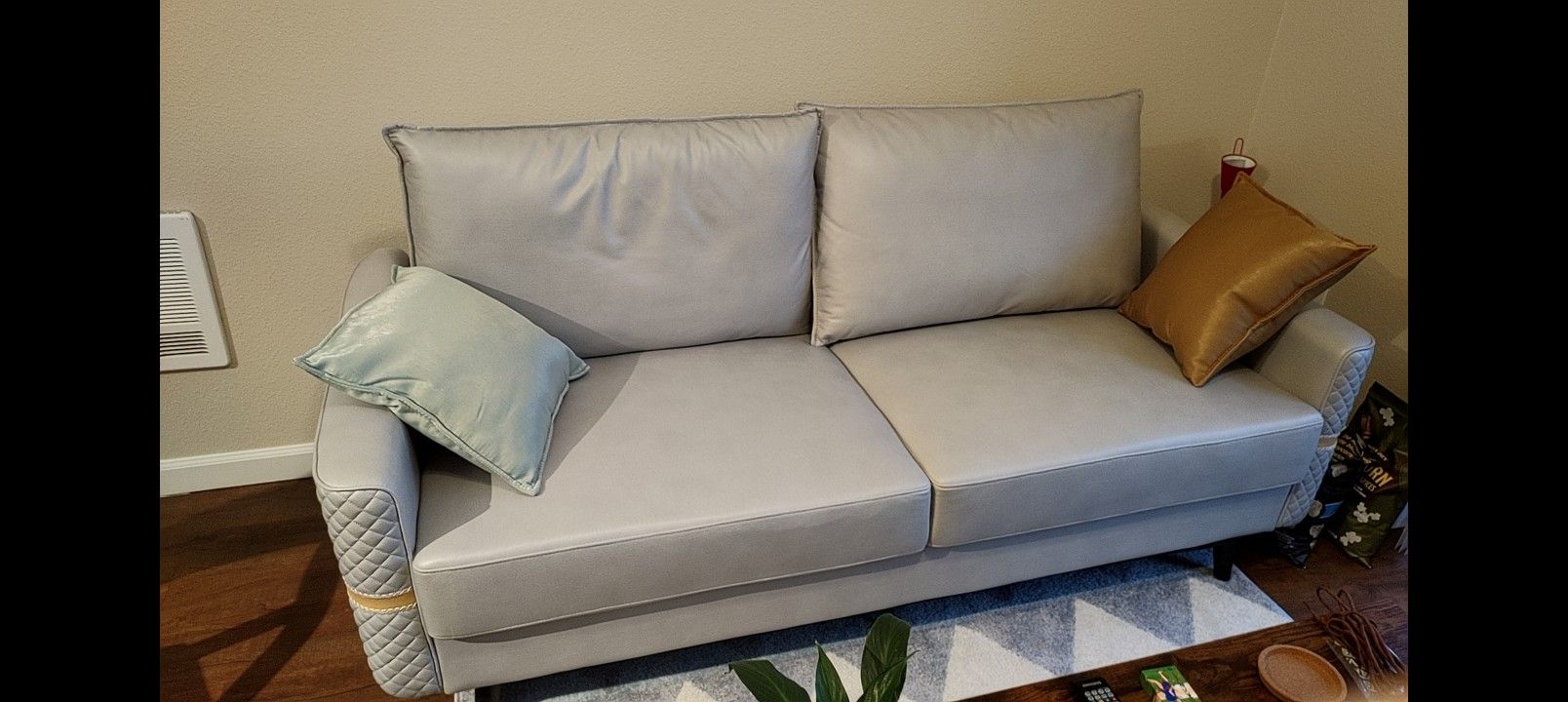 This was a couch I bought for a one bedroom apartment originally and now we have a 3 bed house and is too small for us. We finally got a bigger couch and need to sell. Easy to clean, very light, easy to break down WITHOUT any tools so you can carry it out piece by piece. I loved how easy it was to move with this couch. I'm 5'3" and carried this couch by myself up the stairs. It comes with two pillows (gold and a teal grey green color). You can store some pieces inside the main body of the sofa too for easy storage or moving. Perfect sofa for apartment living or for that temporary in between couch. It's pretty comfy and when you remove the back cushions it's pretty flat and comfy as a small bed for naps. It wasn't advertised as any of these things but it was honestly just a really good couch!