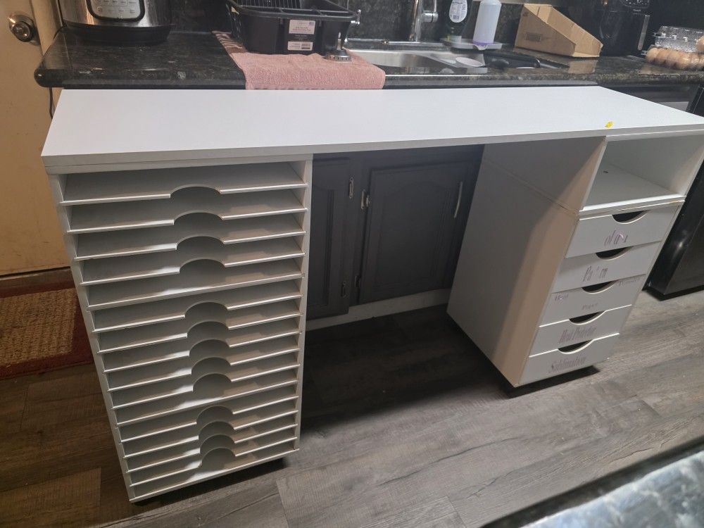 Dresser on one side with counter top. I used for my vinyl. Good condition. The organizer and the center top are from IKEA.