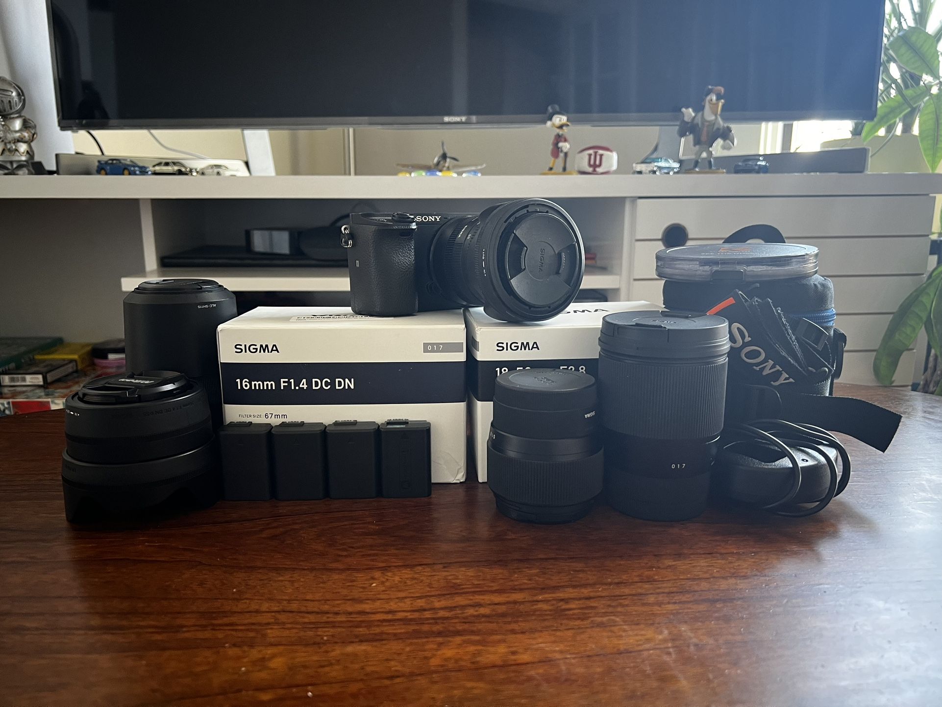 Selling my A6300 APS-C camera kit, will be upgrading to full frame. Everything works great. - 1x Sony A6300 APS-C camera - 1x Sigma 18-55mm f2.8 zoom lens - 1x Sigma 16mm f1.4 prime lens - 1x Sigma 56mm f1.4 prime lens - 1x Sony 55-210mm f4.5-6.3 kit lens - 4x batteries, includes 1 sony original - 1x battery charger, 2slots - 1x ND K&F filter 8-128 55m - 1x Camera tripod, mounting plate included - 1x Sony camera original strap - 1x Camera lens pouch (Includes 2 sigma lens original box) All the hear has been used. Though everything is maintained in excellent working condition. Will mostly like to sell all items together.