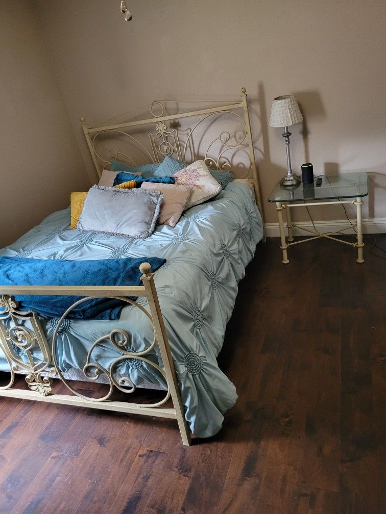 Queen size bed frame (mattress and box springs included if needed) and matching side table. Both bed frame and side table are made of solid iron and are heavy. Side table has glass top that detaches for easier moving. Also have queen size bedding (pillow cases, comforters and sheets) for sale as well.