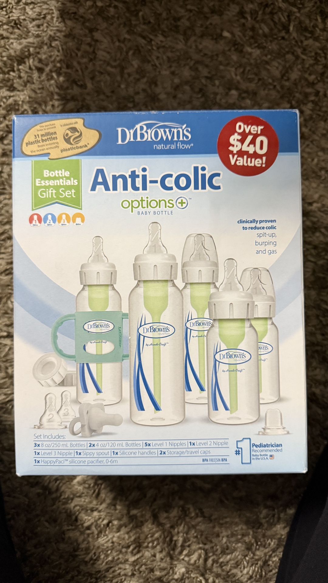 Selling an OPEN boxed set of Dr. Brown’s anti-colic baby bottles in excellent condition. We opened the box and sanitized the bottles before use, but didn’t really end up using them. * (3) 8oz Bottles – Brand New * (2) 4oz Bottles – Gently Used * Original Nipples Included – Never Used (we used Evenflo replacements) * Missing the pacifier that originally came with the set Great quality, trusted brand, and perfect if you're looking to try Dr. Brown’s without buying brand new. Price: $18 Pickup only.