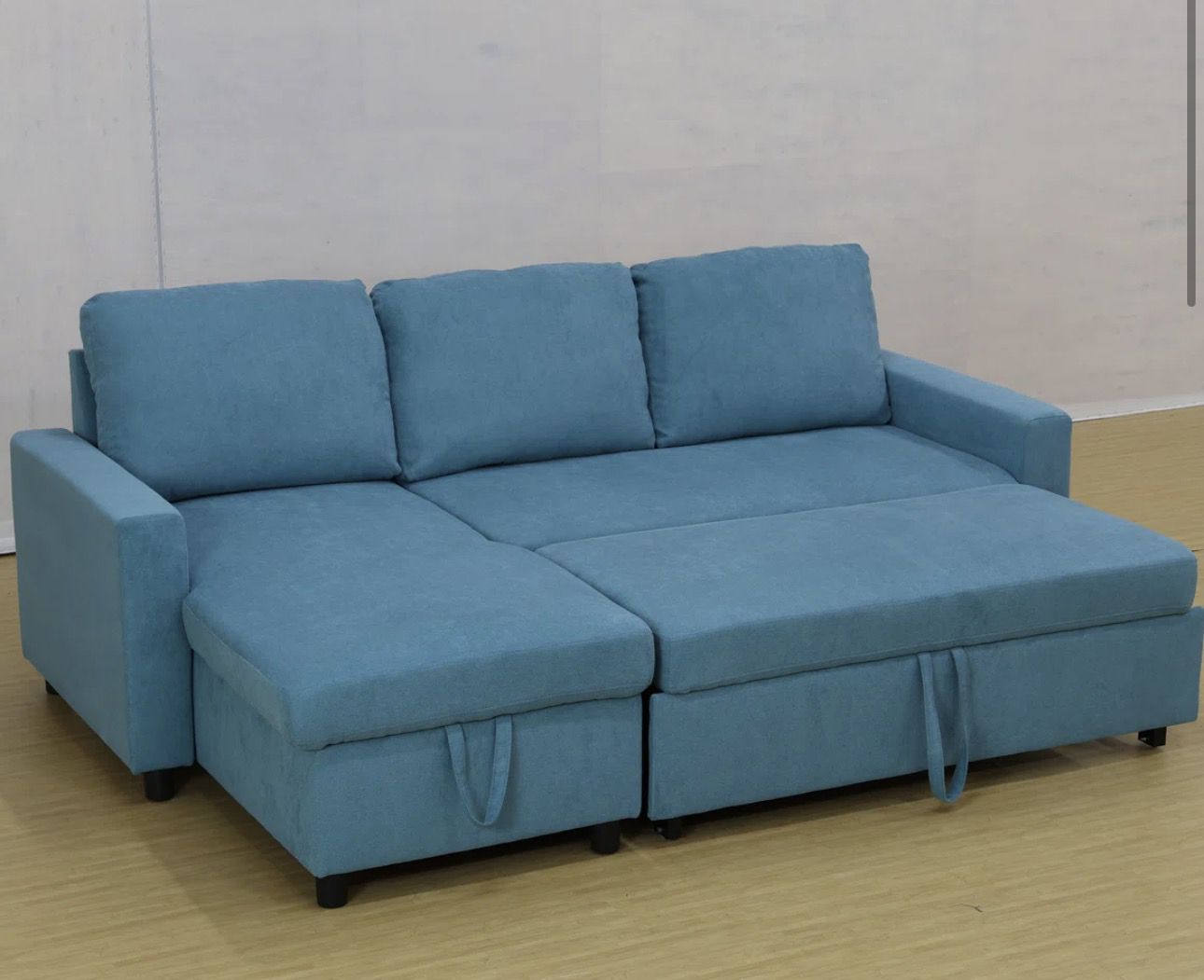 Blue chenille fabric sectional sleeper sofa couch pull out bed