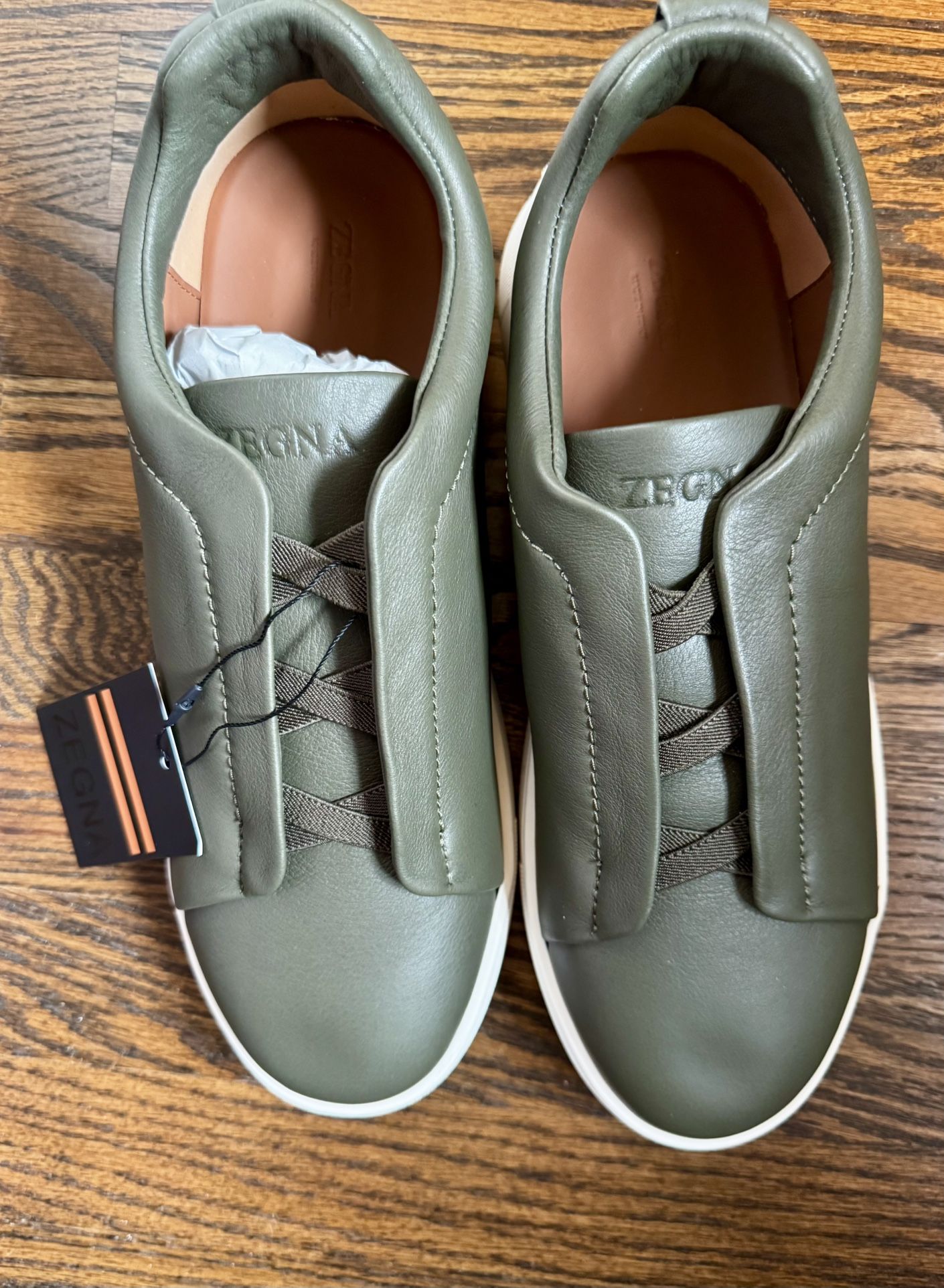 Brand new, never worn green triple stitch–style slip-on sneakers with an Zegna Italian luxury aesthetic. Important disclosure: These are NOT authentic Zegna shoes. They are a DUPE Details: • Color: Green • Style: Triple stitch–inspired slip-on • Size: 12 • Condition: Brand new, never worn • Leather upper with flexible rubber sole • Clean, minimal profile Easy on/off, sharp look, and very versatile with casual tailoring or denim. I bought the wrong size or would keep them. Paid $280 for them.