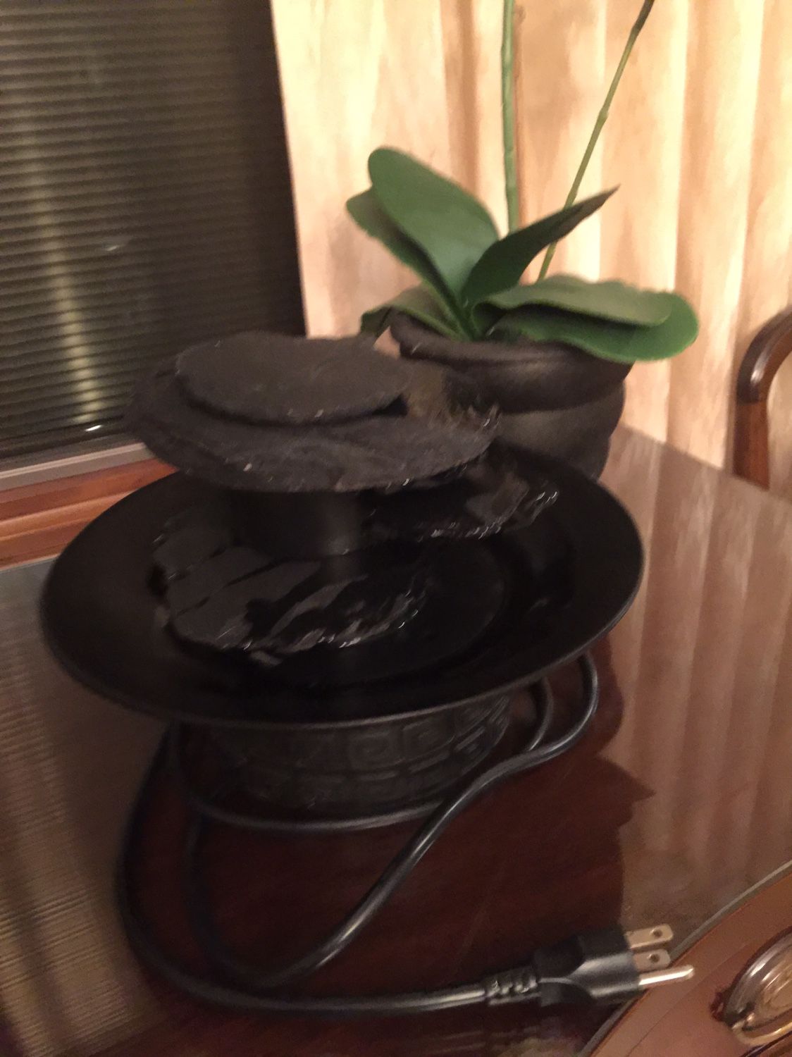 Black 5 tier slate Asian motif 11” diameter tabletop plug in fountain. Very nice appearance. Used, works as it should. Located in Mt. Prospect. Please check my profile for my other offers.