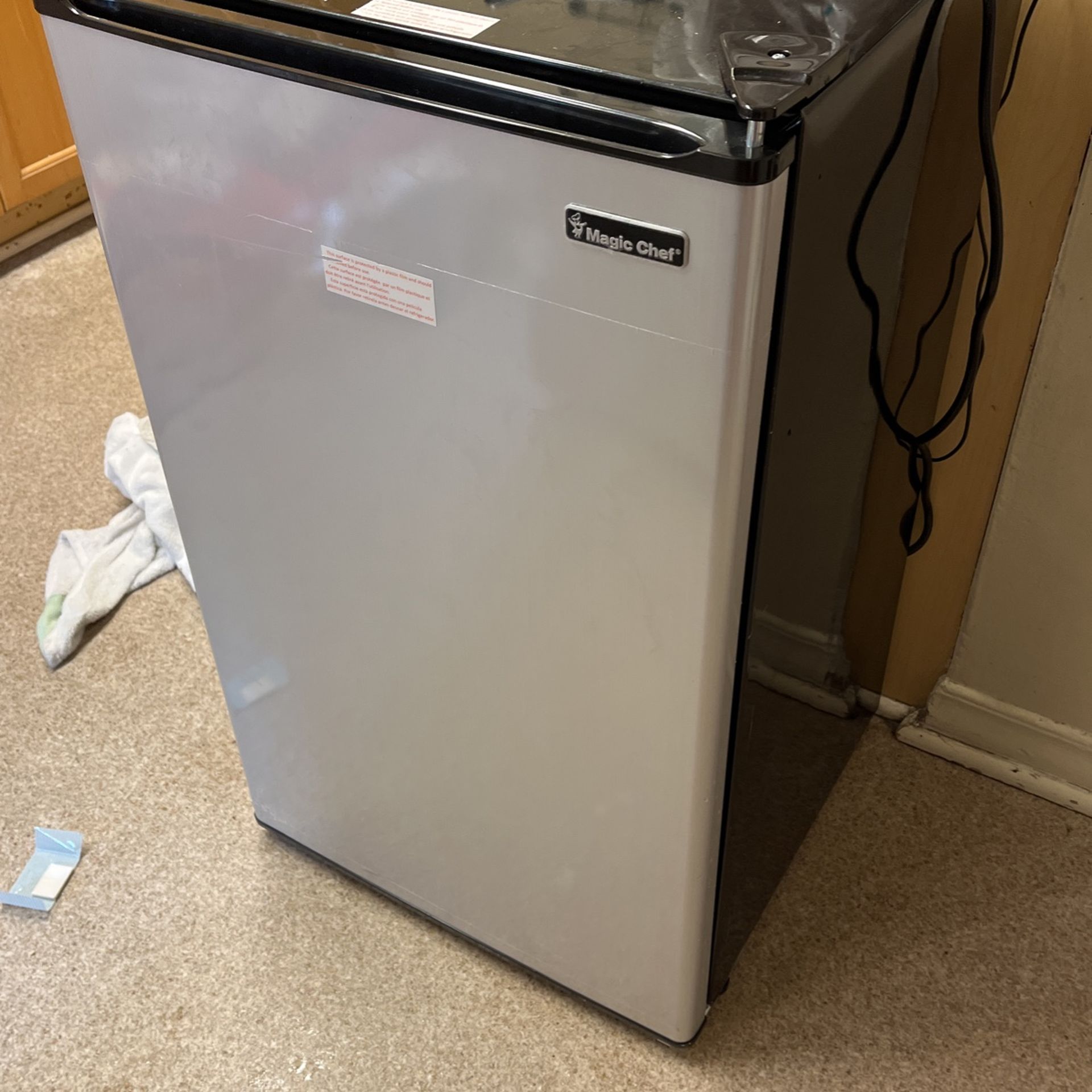 Magic Chef mini fridge used for about a month while they were repairing my big fridge. Does have a corner dented and door screw needs to be tightened. Clear plastic in door never removed. Just cleaned and ready for pickup
