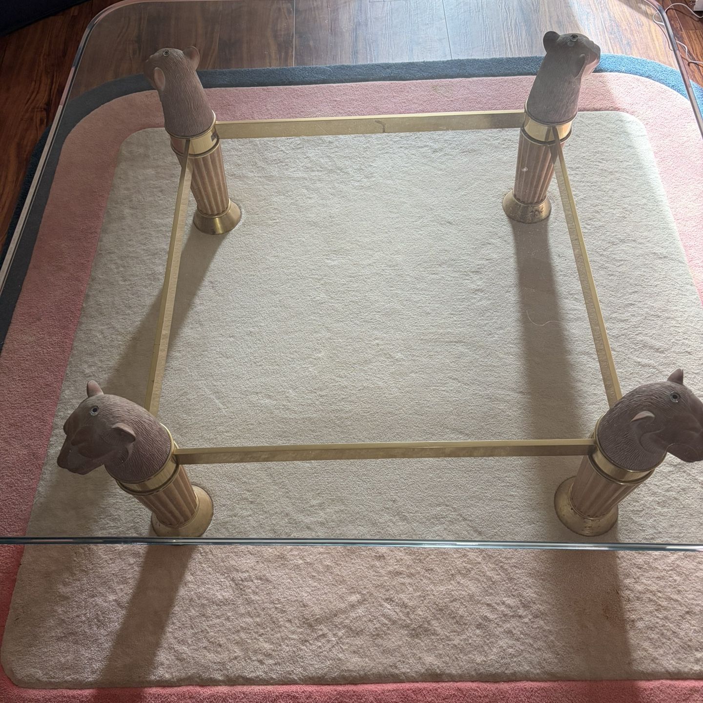 Glass top 44” x 44” 18 inches high legs are of leopard heads and gold does have a little bit of tarnish on it Clearwater area
