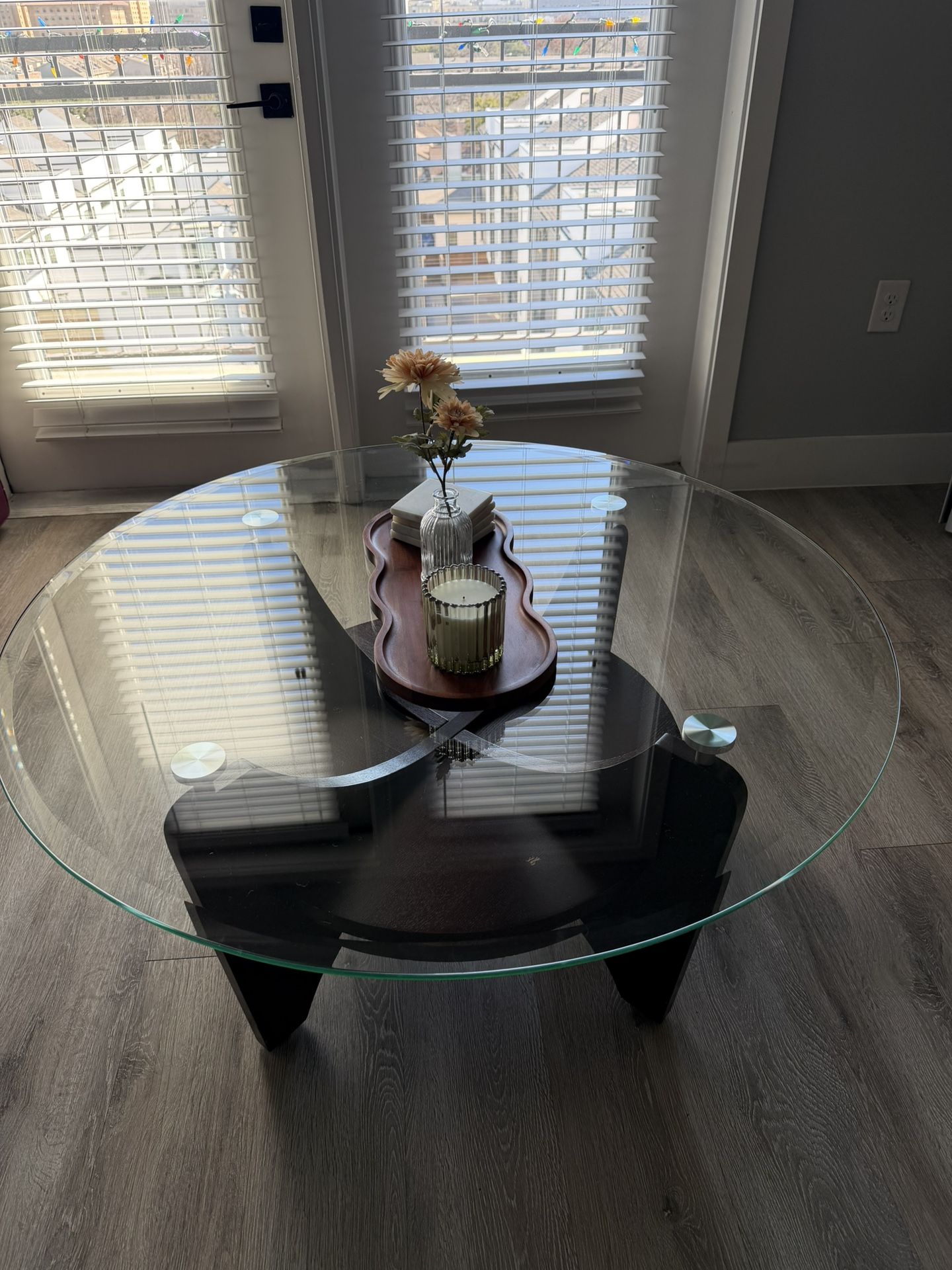 Glass coffee table with 2 side tables sold as a set. Scratch on the glass of the coffee table and scratch on one side table. Some wood chipping on the center coffee table.