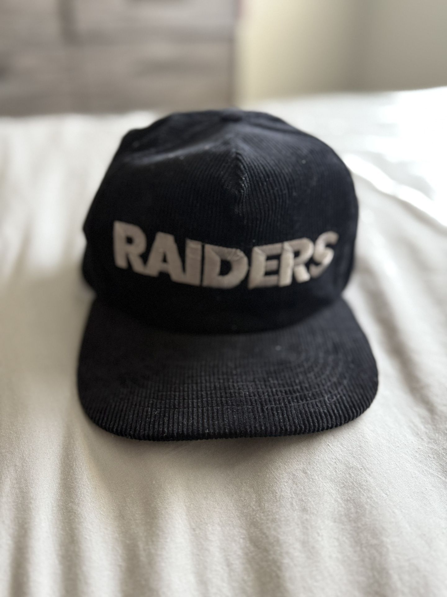 Represent the classic and enduring spirit of the NFL with this vintage Los Angeles Oakland Raiders hat. Made by Starline, this black corduroy snapback cap is a nod to football greats The cap is one size fits all and designed for comfort and style, perfect for any die-hard Raiders fan. This officially licensed NFL product is a must-have for collectors and fans alike. Show your team pride with this stylish and timeless piece of sports memorabilia. Whether you're at the game or out on the town, this Raiders hat is the perfect accessory for any football enthusiast.