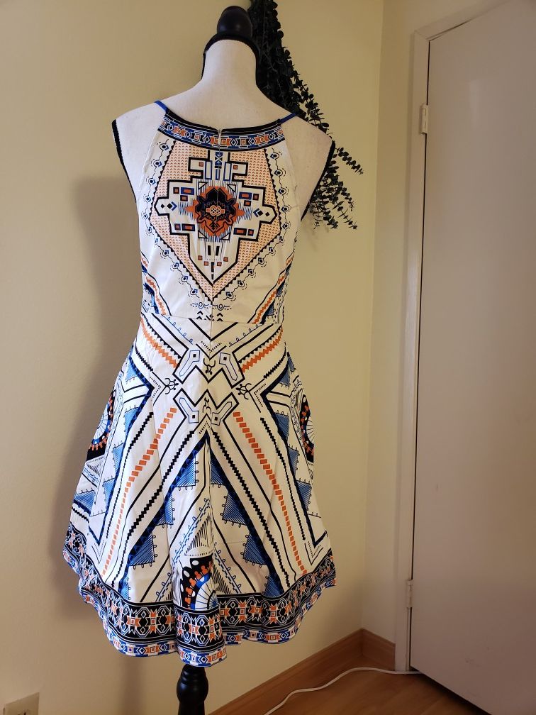 Cotton blend mini dress. Very unique print and exotic color harmony. Sizes Medium and Large available.