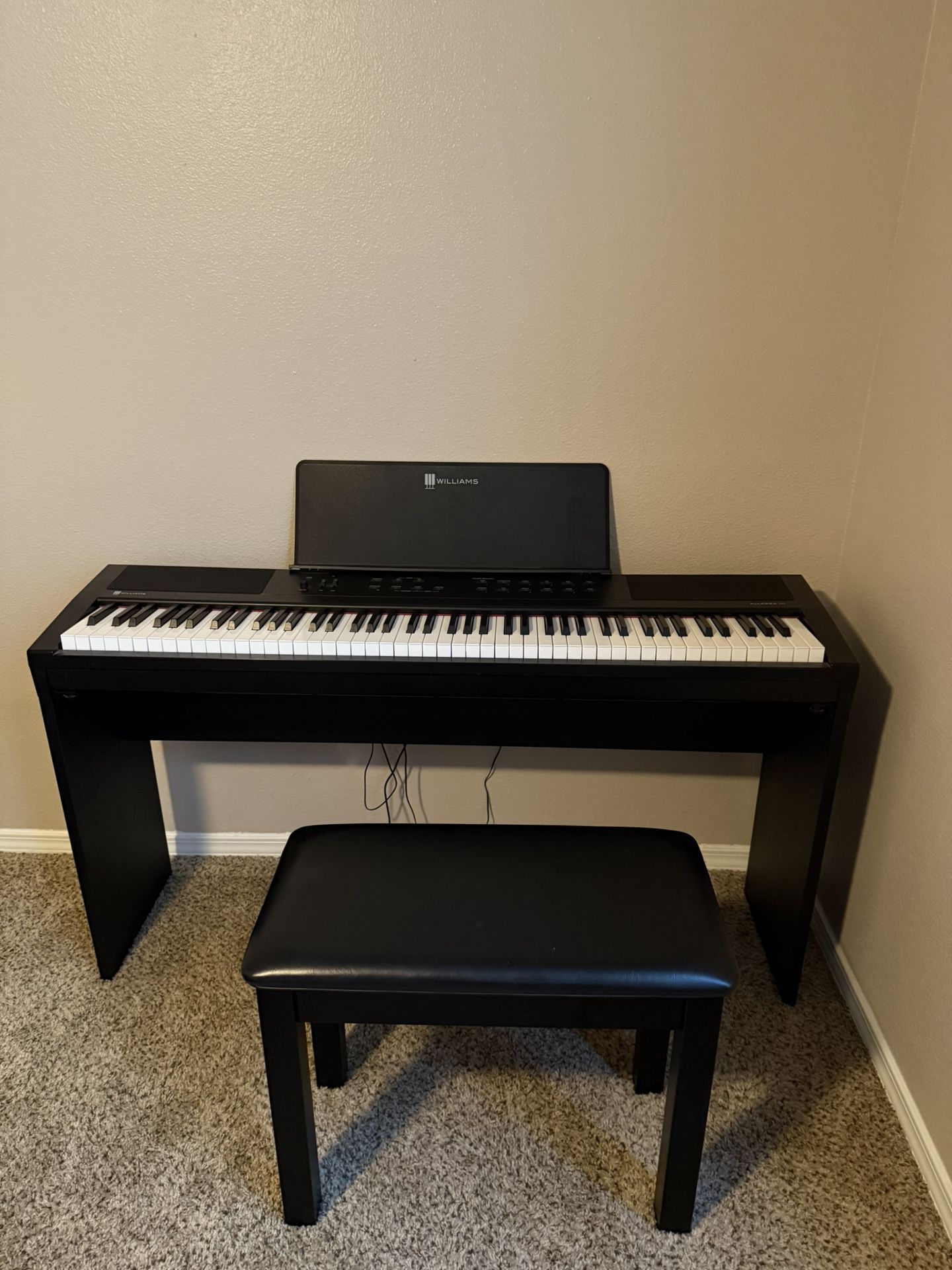 Selling my Williams Allegro III digital piano in excellent condition. Moving soon and need to get rid of everything quickly ✔️ Full-size 88 weighted keys — feels like an acoustic piano ✔️ Includes stand, padded bench, and sustain pedal ✔️ Perfect for beginners, intermediate players, or anyone wanting to practice at home ✔️ Clean, well maintained, and fully functional Asking $450 OBO (or best offer) cost me $650 brand new