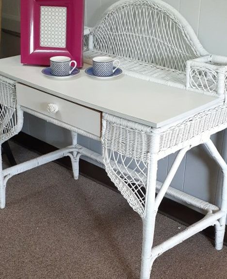 Sweet white wicker desk and or secretary. Shows minimal wear. Convenient storage on the top/back. And a pull out drawer. Sturdy Construction. There is also a matching magazine rack and a round foot stool. (Not pictured)