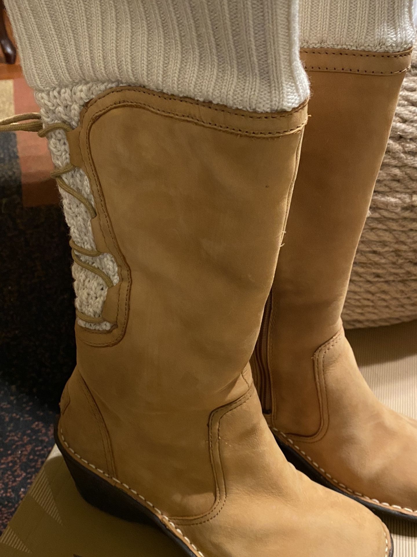 Worn twice Description This surf inspired Collection is known for its comfort. The styles in this collection range from casual to more fashionable by utilizing two different heel heights. Upper: Soft, rich leathers and Scotch Guard protected suedes with a heat embossed logo. Styles are sprinkled with knit. All styles have sheepskin lining. Insole: A suede covered soft Poron footbed provides unparalleled comfort for this collection. Heat embossed heel logo. Outsole: Molded clear rubber with cork. Low heel height is 1 ½" and high heel height is 2 ½". This boot features leather vamp and shaft, knit underlay and cuff, and waxy cotton lace up on the back shaft. The shaft is about 13 inches tall.