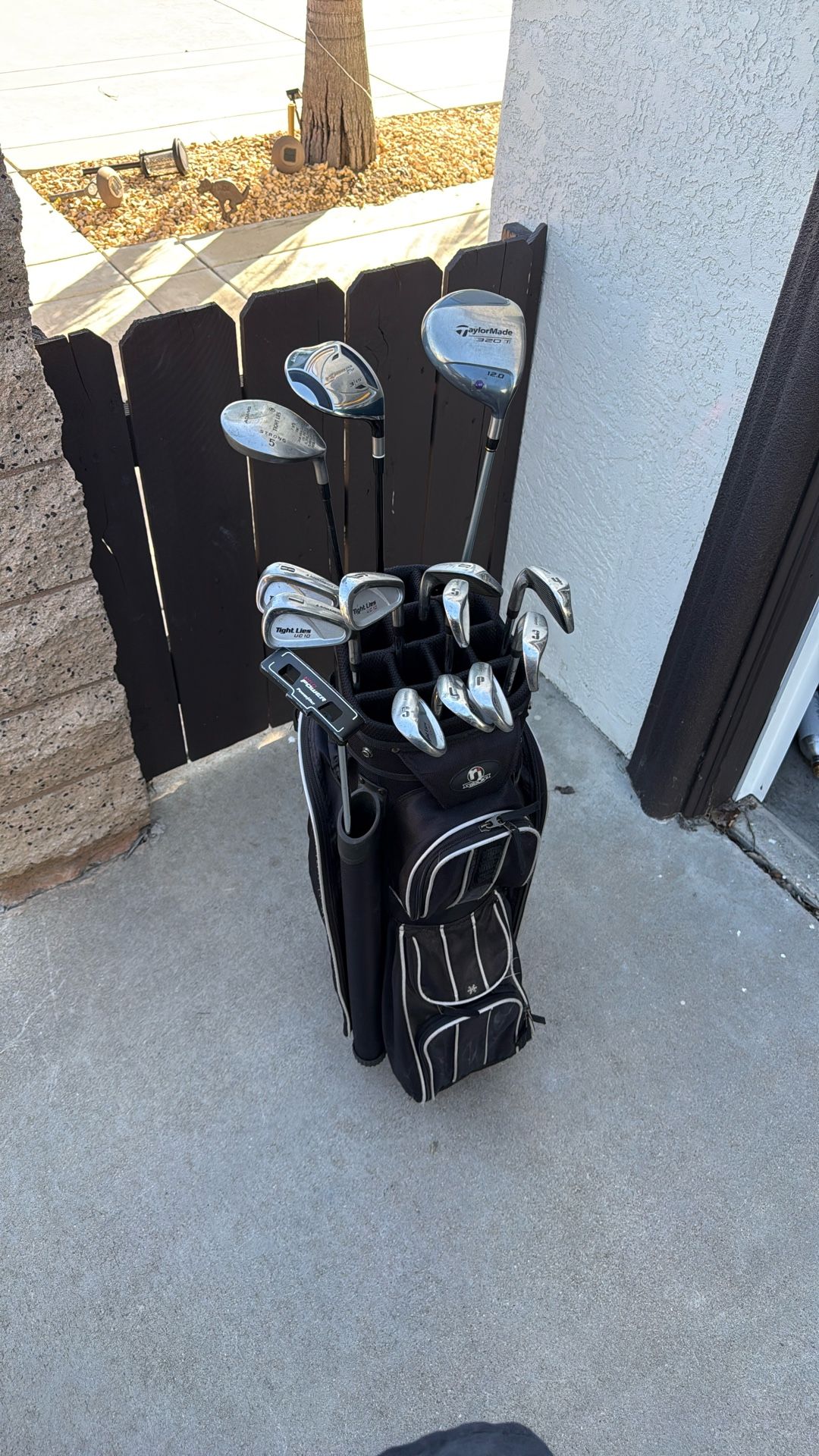 Complete starter set comes with RJ golf bag, power bilt pro power putter, Taylormade 320 ti 12 deg driver, Adams golf 15 deg 3 wood, Adams golf 19 deg 5 wood and Adams golf tight lies UC10 irons 3 through 9, plus sand wedge, lob wedge and pitching wedge. Complete set ready to play