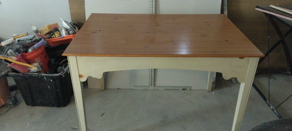 Desk is solid . With light wood in color can get measurements. If needed . Excellent condition rarely used but was used as a sewing table for a few days was too big need gone. 50$ obo within reason.