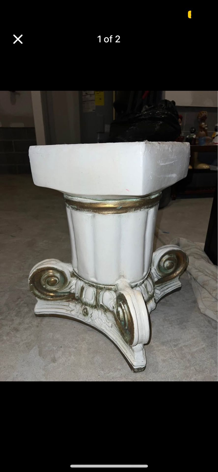 Add a touch of elegance to your home with this beautiful decorative pedestal stand. Perfect for displaying plants, vases, sculptures, or accent décor. It features classic scroll detailing, gold accents, and has a good amount of weight to it, giving it a sturdy, high-quality feel. ✨Details: • Height: 18 inches • Heavy, stable design • Vintage-inspired scroll + column base • Neutral cream & gold tones • Great for living rooms, entryways, or event décor • In good condition Perfect statement piece for anyone who loves unique architectural décor. Message me if interested! 😊Meet-ups: I can meet in the RDU area - Raleigh, Durham, Cary, Holly Springs, Fuquay-Varina, Angier as well as Fayetteville !